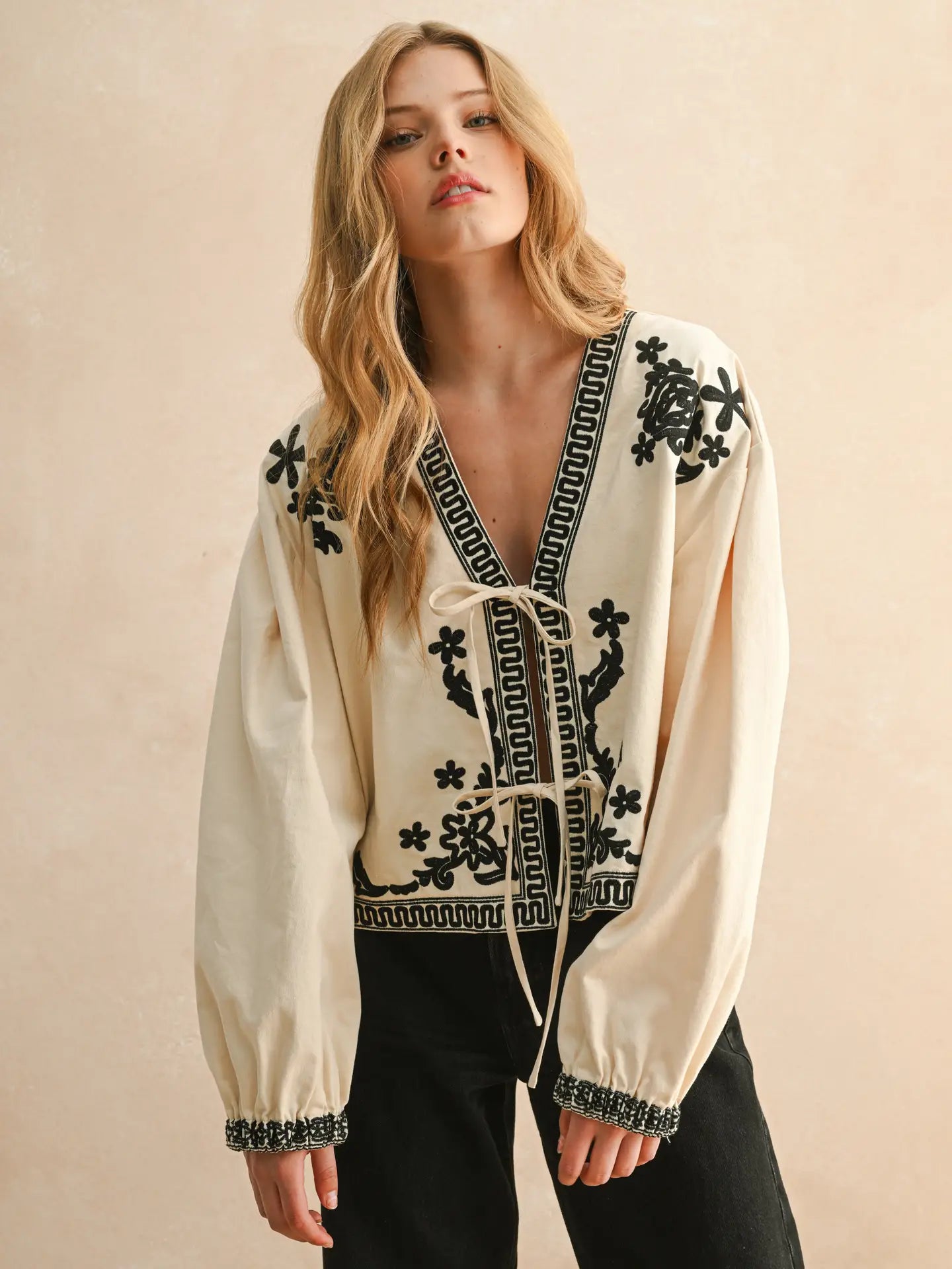 Embrace the season in style with our Autumn Stroll Jacket! This cream-colored beauty features striking black detailing that adds just the right amount of edge, while the charming tie-up front lets you adjust the fit to your mood. Perfect for layering over your favorite fall outfits, it's the cozy companion your wardrobe has been waiting for. Whether you're heading to the pumpkin patch or a casual coffee date, this jacket brings effortless charm to every adventure.