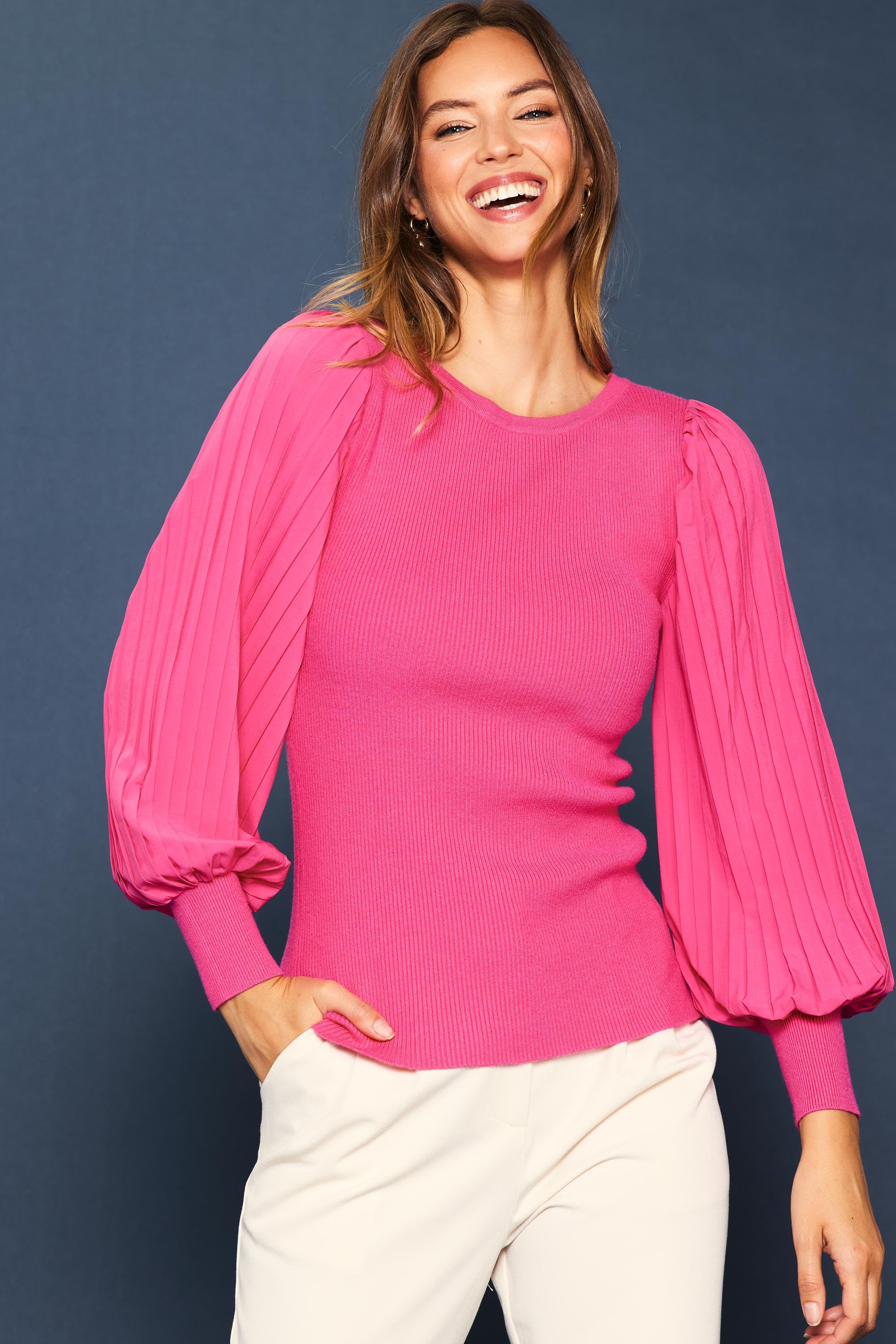 Stay cozy and chic in this berry-pink sweater featuring a mix-media design. It has long pleated sleeves and is crafted from lightweight burnout knitted fabric, making it perfect for a transitional look. Be ready for wherever the day takes you with this stylish number!