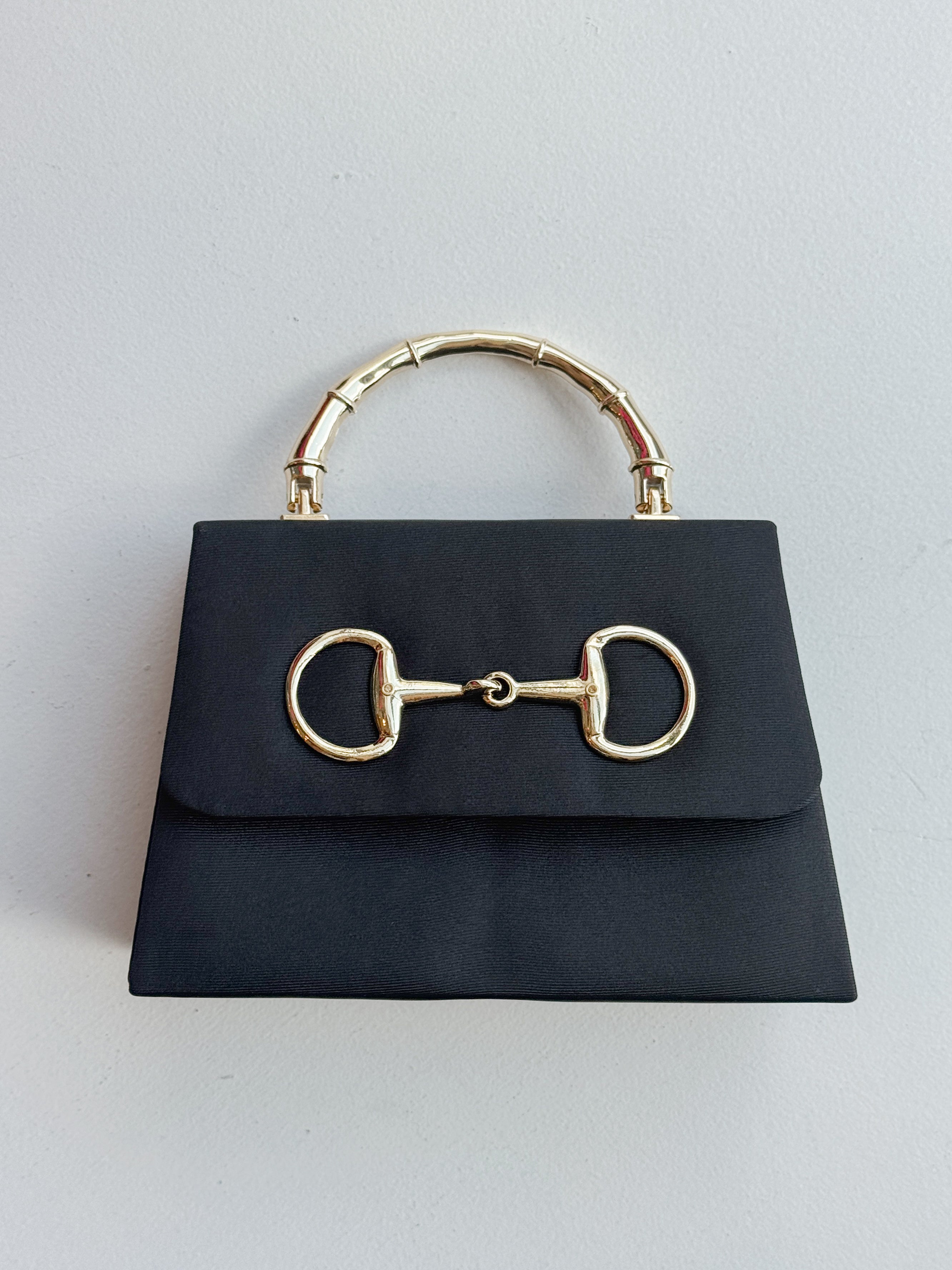 The Black Lulu Bag combines sleek black elegance with playful gold bamboo handles featuring your choice of a horse head or snaffle detail. Its snap closure keeps your essentials secure, while the unique accents add a whimsical touch to any outfit. Perfect for those who love a mix of chic and cheeky style.