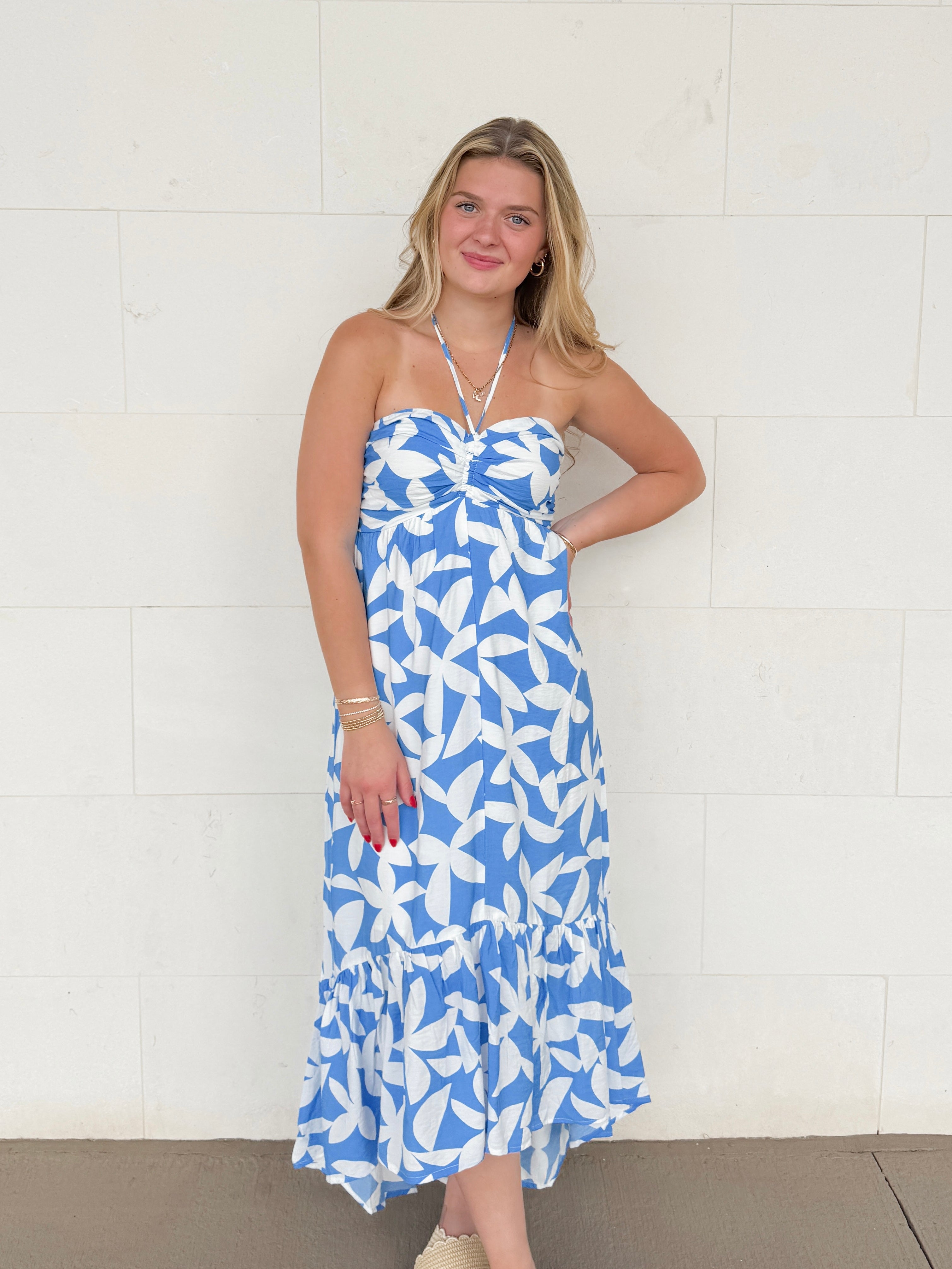 Get ready for some tropical vibes with our Blue Palms Dress! Featuring a light blue and white halter design, this dress will have you feeling like you're on vacation. With a playful tropical pattern, you'll be sure to turn heads. Perfect for any summer occasion!