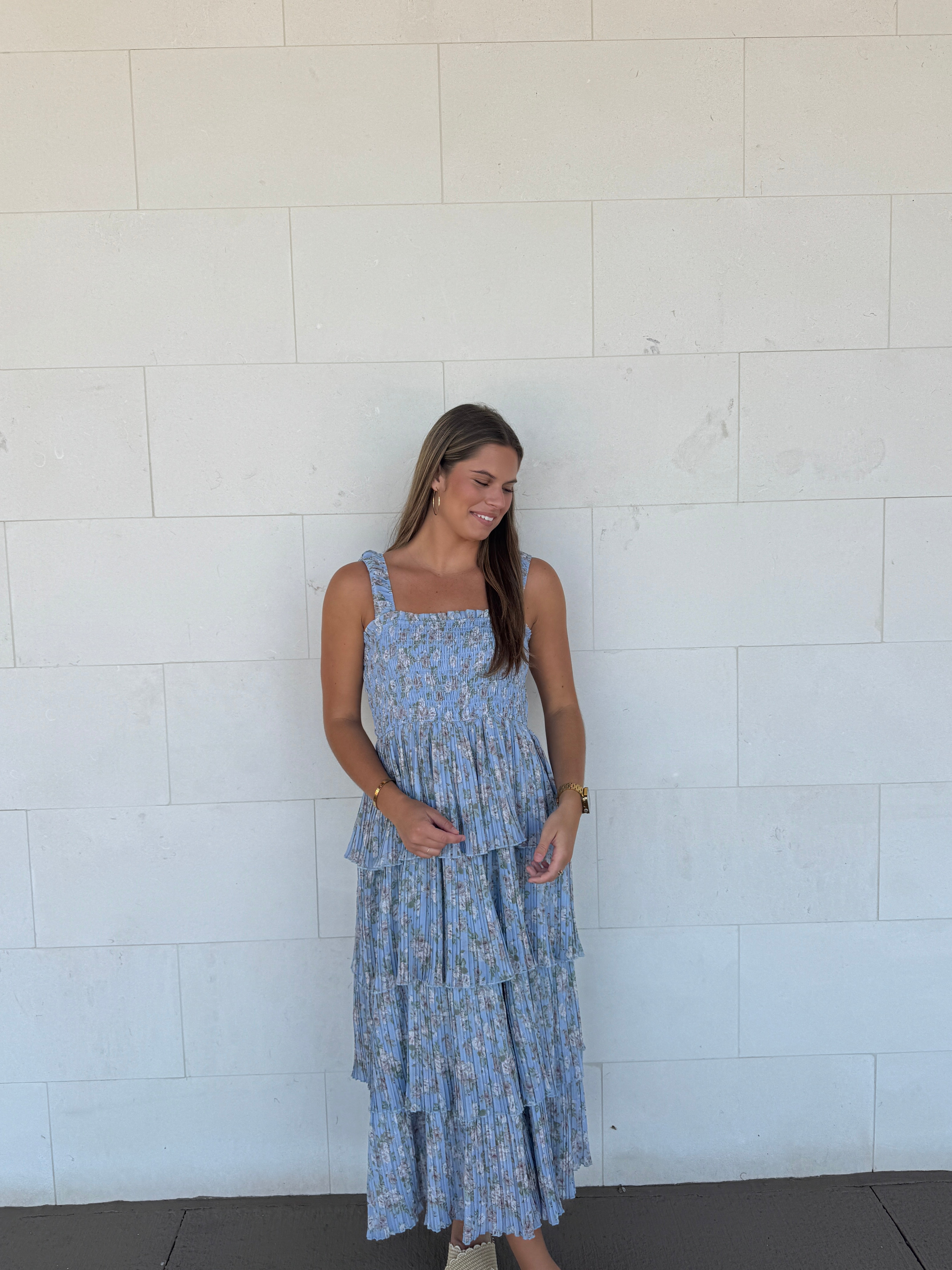 Get ready to look effortlessly chic in our Bluebell Gardens Dress! This baby blue midi dress boasts tiered ruffles and a flattering tank top design. Featuring a stunning floral pattern, this dress is perfect for any occasion. Say hello to your new go-to dress!