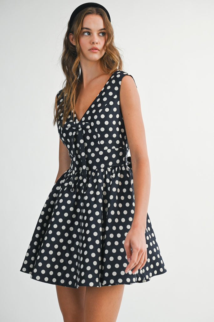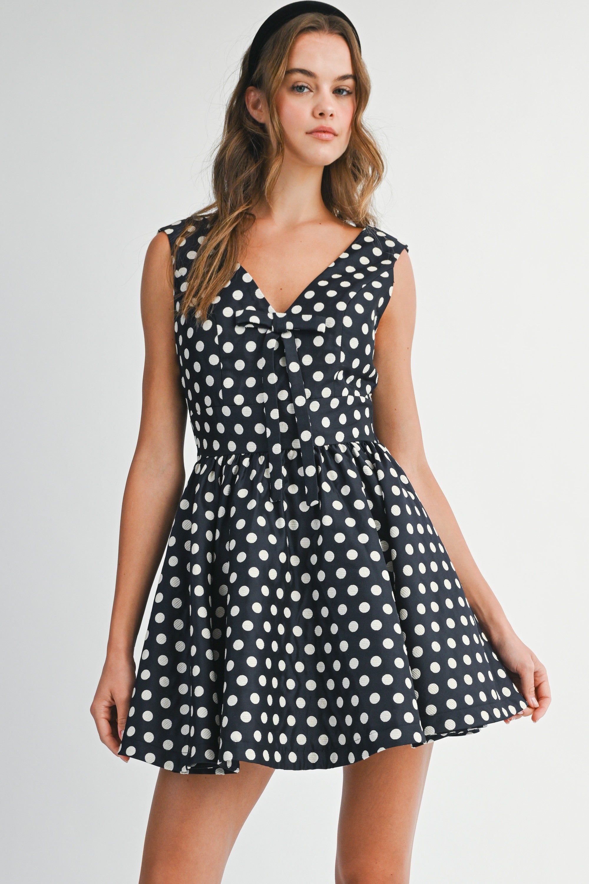 Embrace timeless playfulness with the Classic Charm Short Dress. This navy dress features cheerful white polka dots, a breezy tank top silhouette, and delicate bows at the front for a touch of whimsy. Perfect for sunny days and casual outings, it combines comfort and flirty style effortlessly.