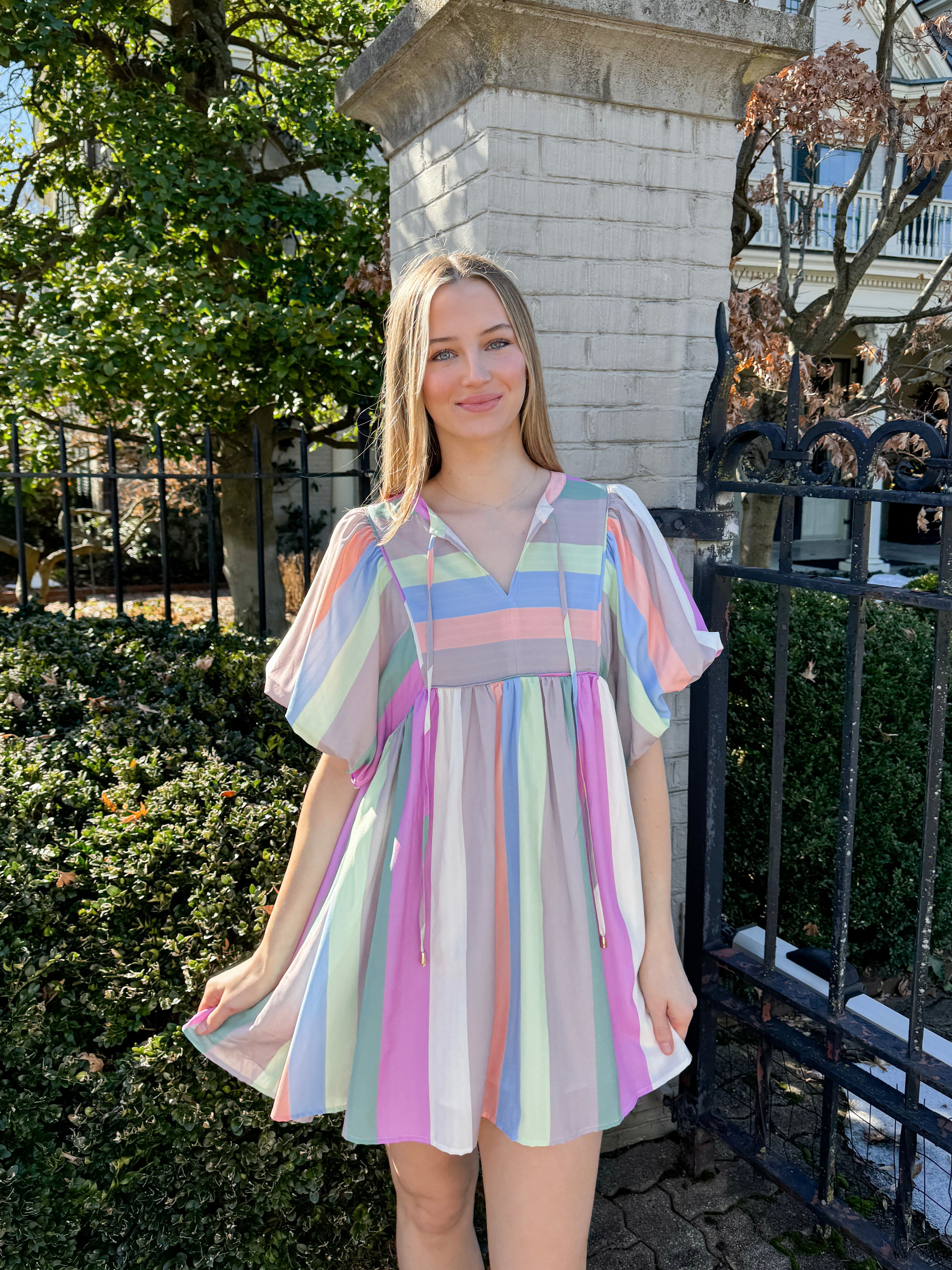 Multicolor striped bubble sleeve babydoll dress featuring self tie at neck. Lined. Woven. Non-sheer. Lightweight.