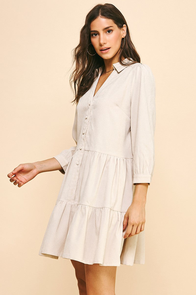 Introducing our Coastal Cowgirl Dress, featuring a classic collar and button down design, along with 3/4 sleeves and a tiered skirt. Perfect for a day in the sun or a night out on the town, this dress combines style and comfort effortlessly.