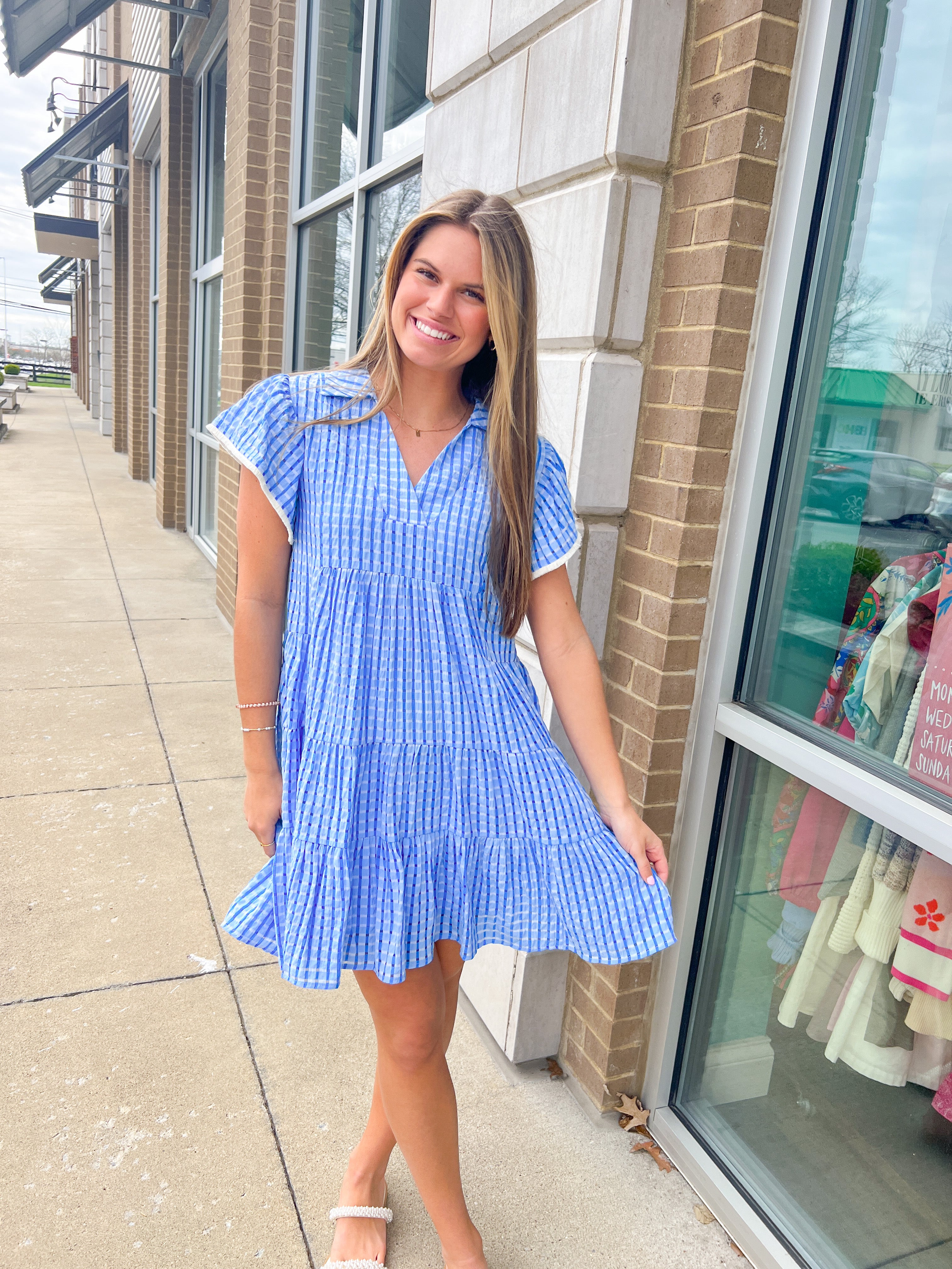 This Collared Sheer Gingham Ruffle Slv Dress is perfect for an elegant look. The sheer gingham fabric is lightweight and comfortable, while the ruffled collar and sleeves add an intricate detail to your ensemble. Perfect for special occasions.