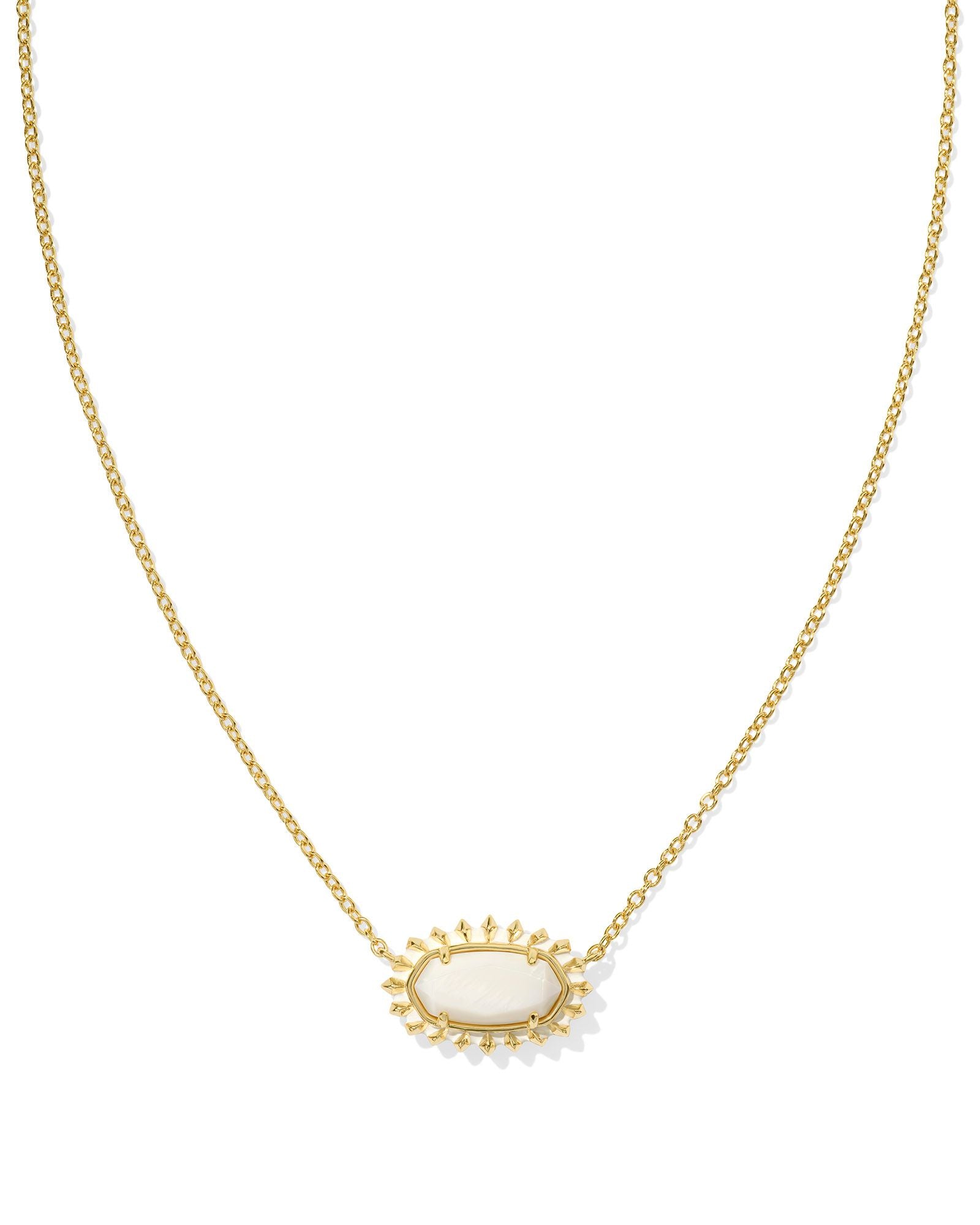 More radiant than ever, it’s our bestselling icon! The Elisa Gold Color Burst Frame Short Pendant Necklace in White Mother of Pearl amps up our signature shape with a sunburst frame, crafted with a striking mixture of metal and enamel. The sunburst design carries over to the backside, where linear motifs create eye-catching rays—which also means it’s reversible.