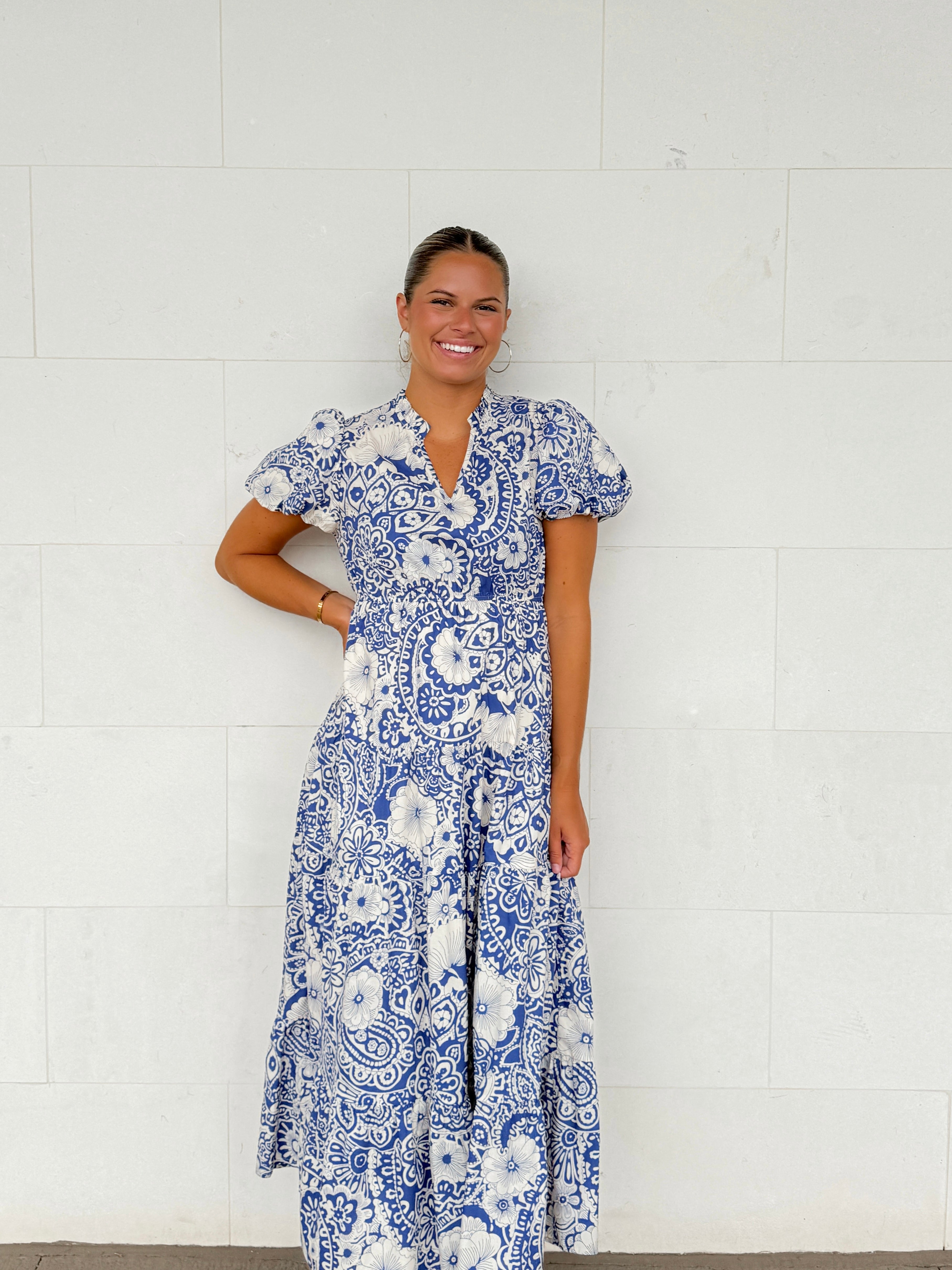 Embrace sunny days in the Floral Daydream Dress, a blue and white maxi adorned with a charming floral pattern. Its short sleeves and flattering V-neck create a breezy, playful look perfect for twirling through gardens or casual outings. Light, comfortable, and effortlessly stylish, this dress invites you to daydream in every step.