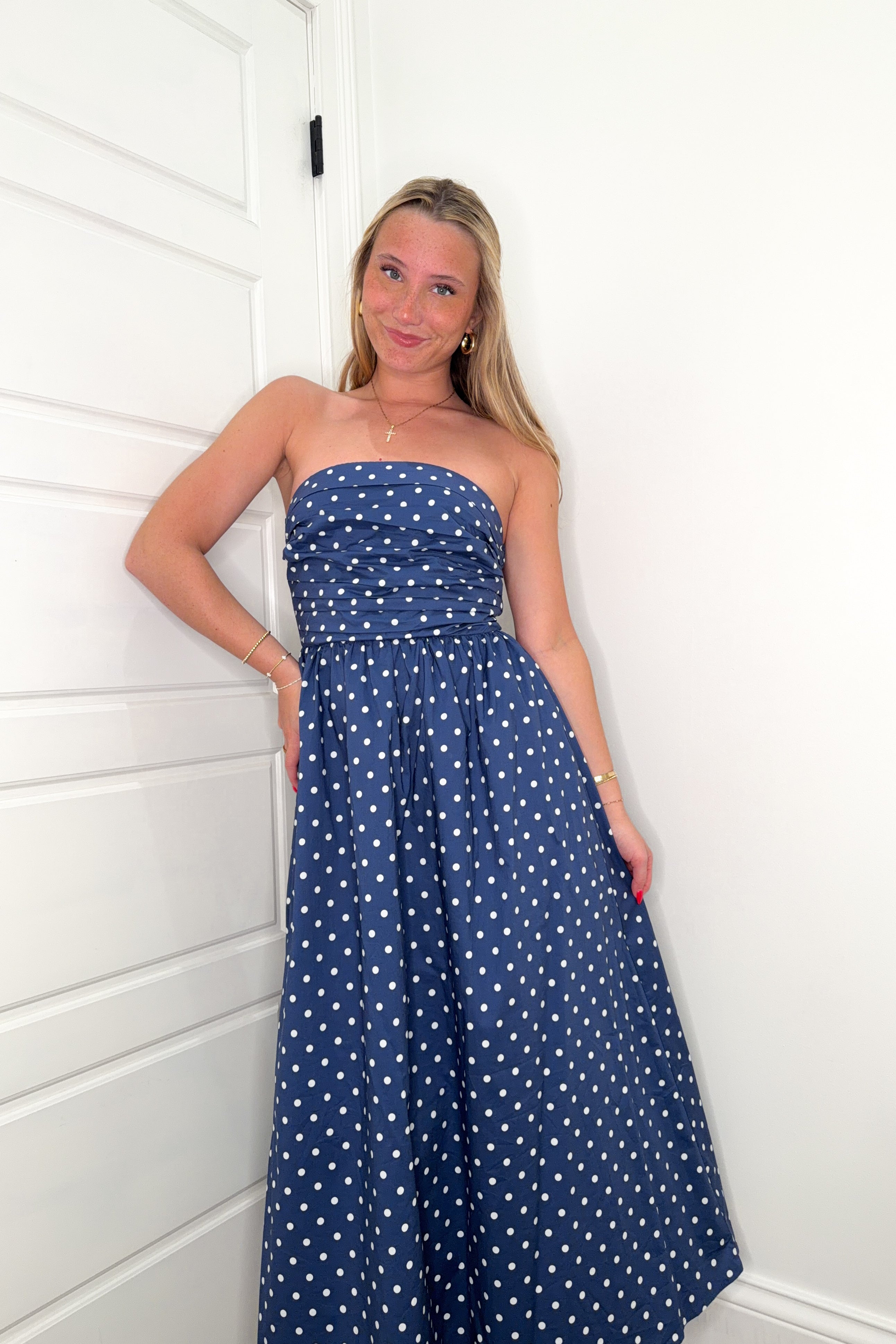 Effortless elegance meets playful style with this Harbor View Maxi Dress. The navy tube top silhouette offers a sleek, sophisticated look, while charming white polka dots add a touch of whimsy. Perfect for summer events, beach getaways, or casual evening outings, this maxi dress combines comfort with timeless appeal. The strapless design flatters all figures, making it an essential addition to any wardrobe.