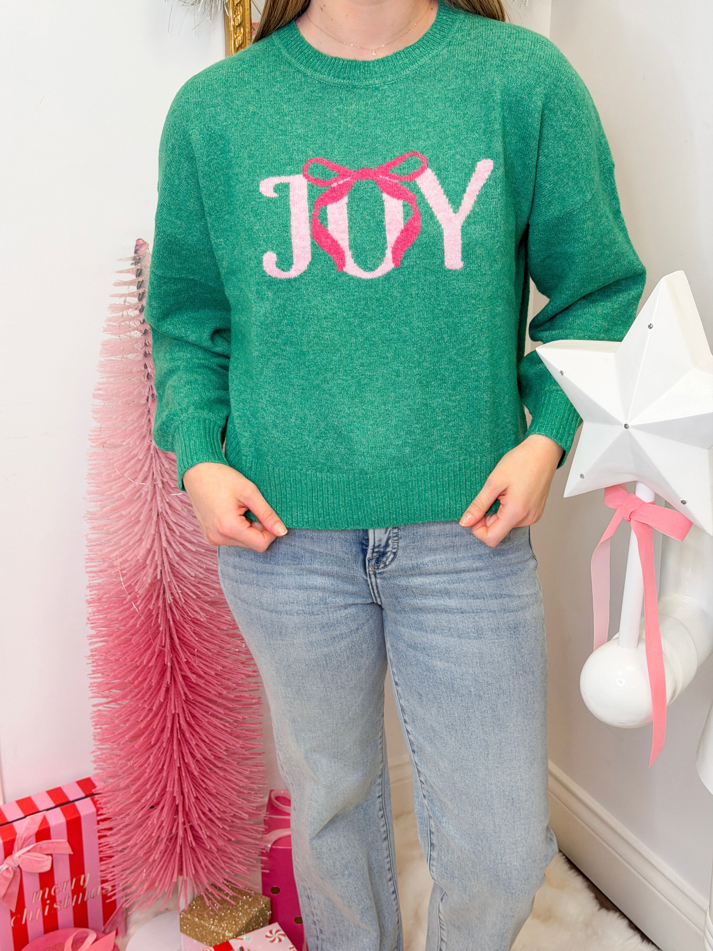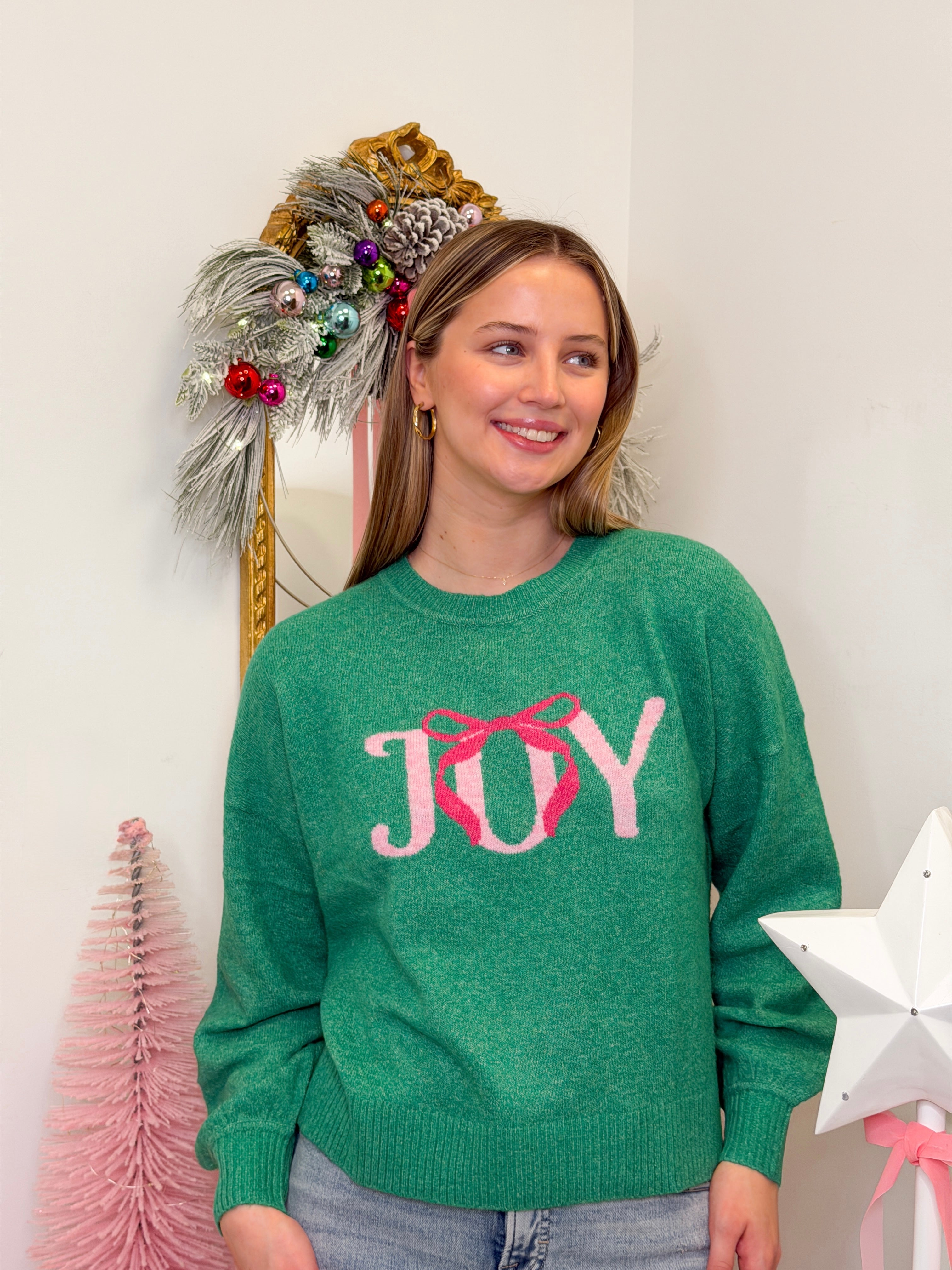 Celebrate the season in style with The Joy Sweater, featuring a cheerful green design where the "O" in "Joy" is creatively replaced by a festive wreath. This playful sweater brings a touch of holiday spirit to your wardrobe, perfect for spreading smiles and cozy comfort all season long.