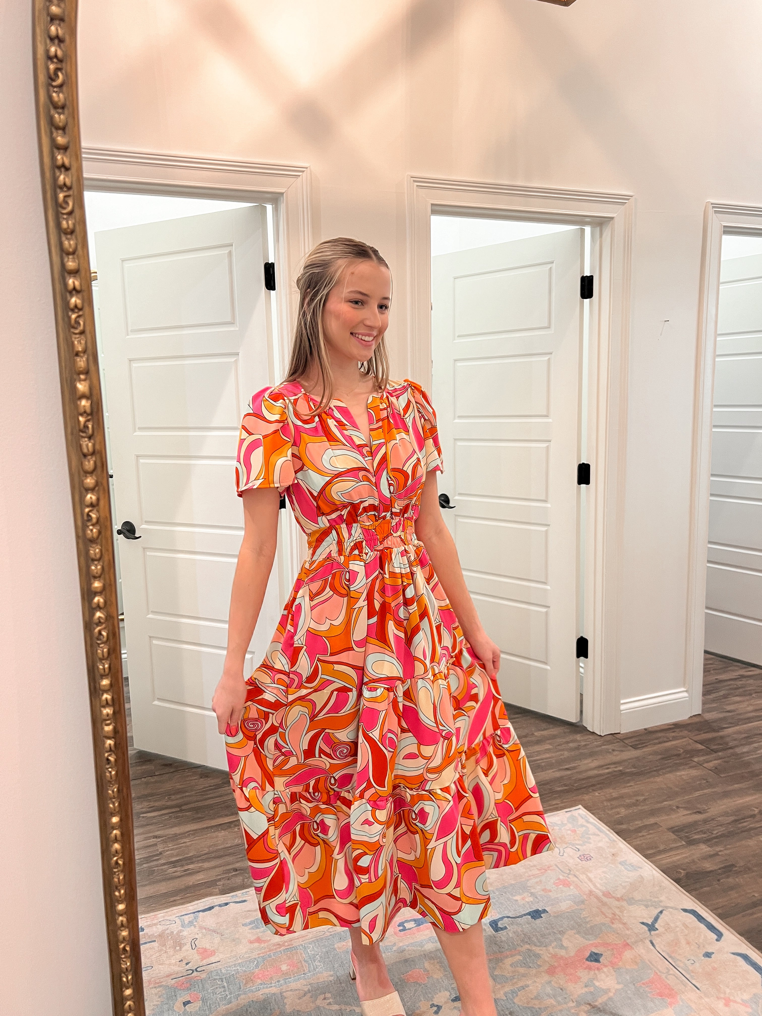 Stay cool and stylish in the Keeping It Groovy Maxi Dress. With its short sleeves and unique print, this dress is perfect for any occasion. Groove on and stand out in this playful, eye-catching dress.