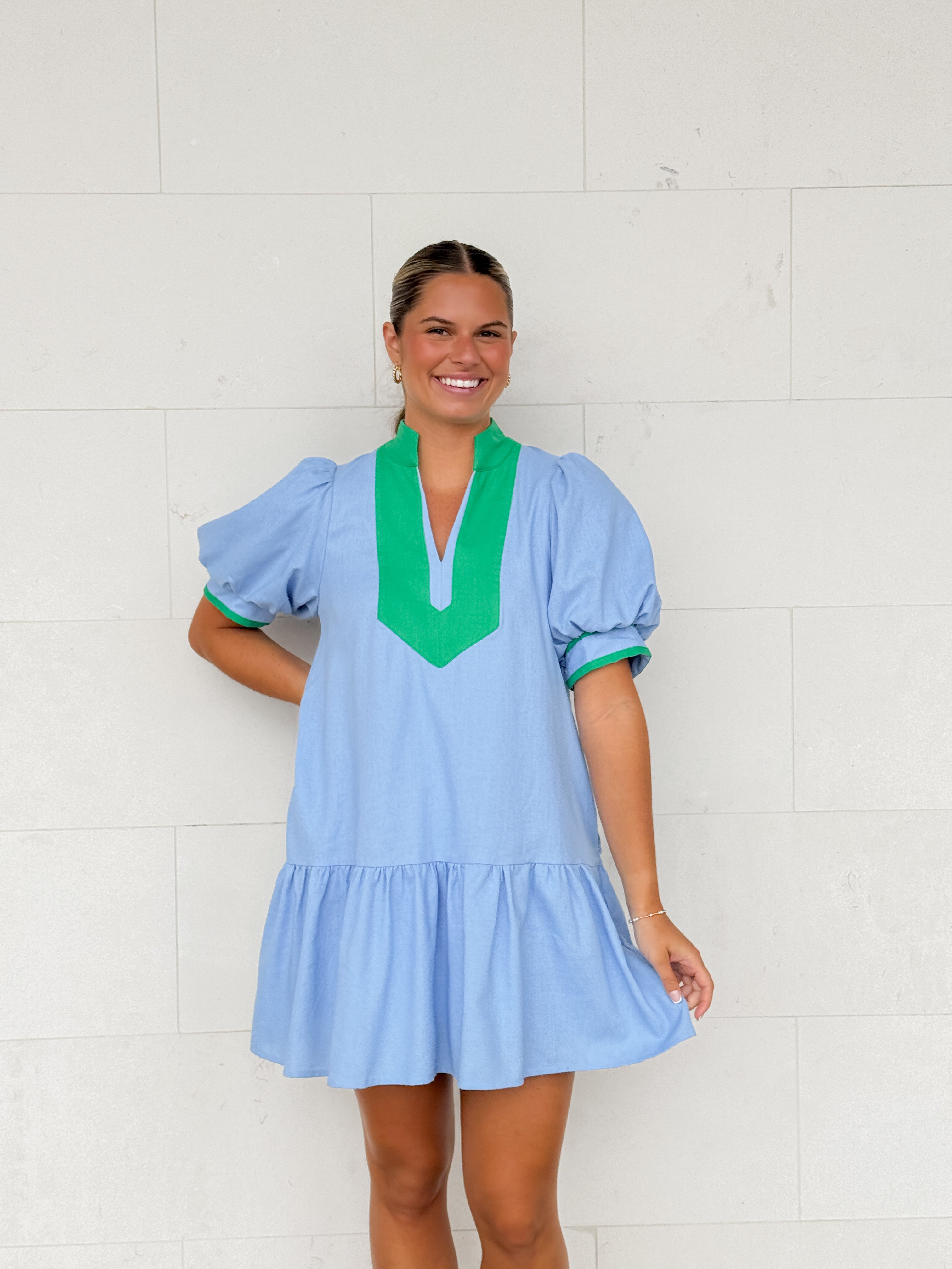 Dive into summer with our Lagoon Grove Dress! This playful blue number features eye-catching green detailing that frames the flattering V-neck and short sleeves. Perfect for beach