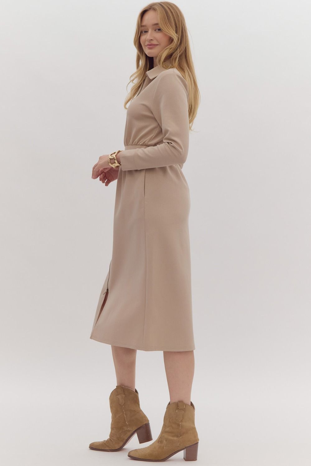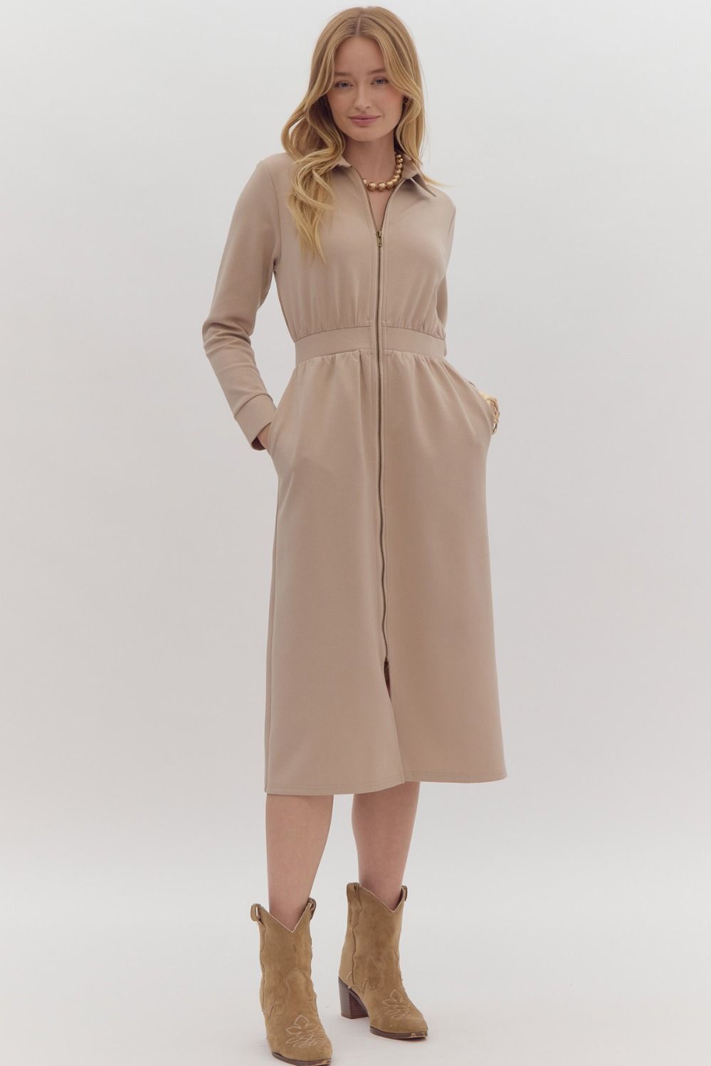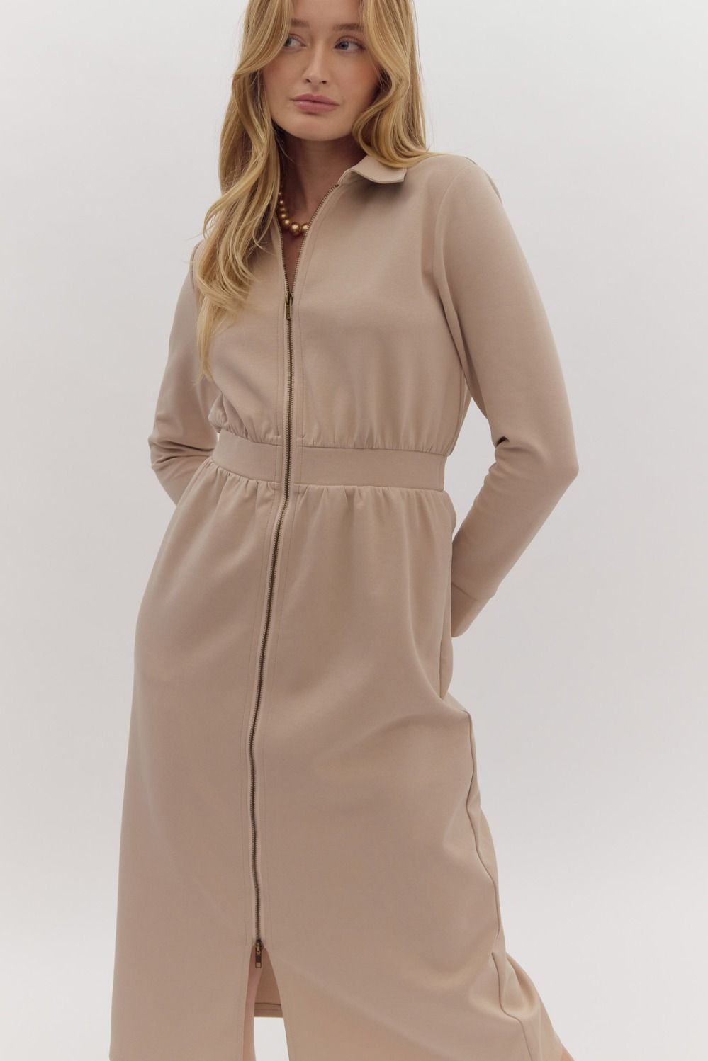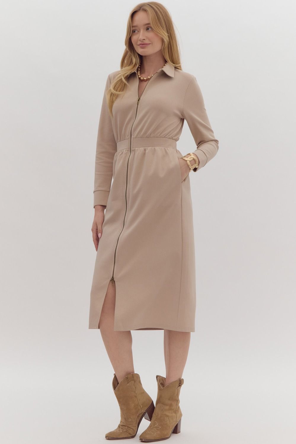 Elevate your wardrobe with our  Crafted from luxurious cashmere, this dress features long sleeves and a sleek front zipper for a modern touch. Step out in style and comfort with this versatile and chic brown dress!