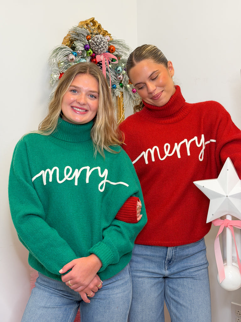 Celebrate the season in style with the Merry Magic Sweater! This cozy turtleneck comes in festive red and green, featuring “merry” embroidered in white cursive across the front. Perfect for spreading holiday joy! Whether you're decking the halls or enjoying a winter stroll, this sweater adds a playful touch to all your festive moments.