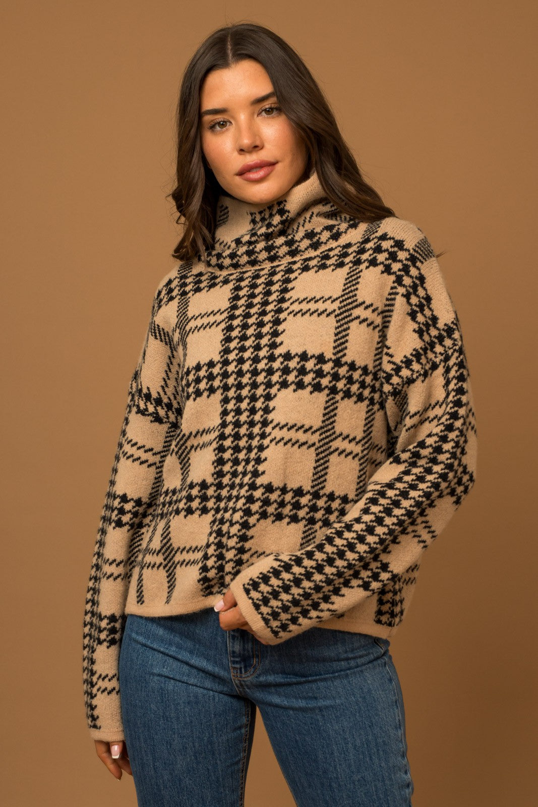 Stay warm and style on-point in this Perfect Fall Day Sweater. The turtle neck and hound tooth pattern is sure to make heads turn this season! So grab this cozy sweater and enjoy the crisp chill of the perfect fall day!