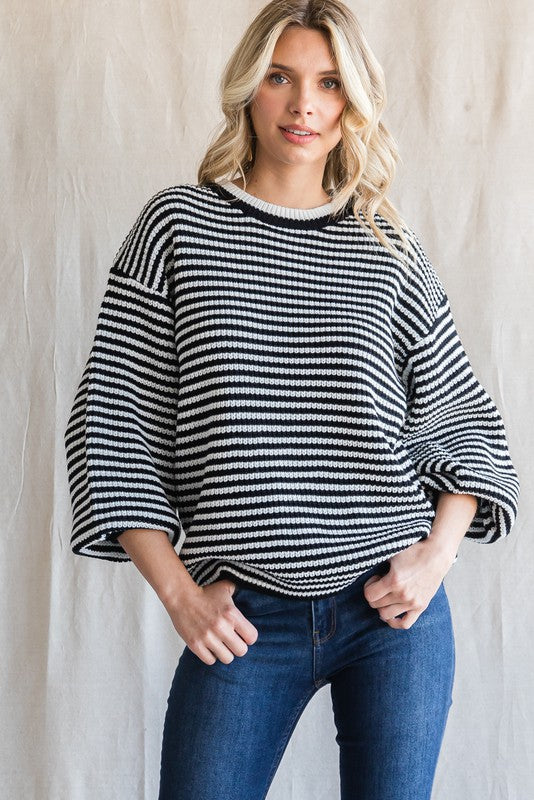 Striped print knit pullover sweater with crew neckline, drop shoulder, long peasant sleeves, and ribbed hems. - Unlined, non-sheer, lightweight. - Model is 5'8'' and is wearing a Small.