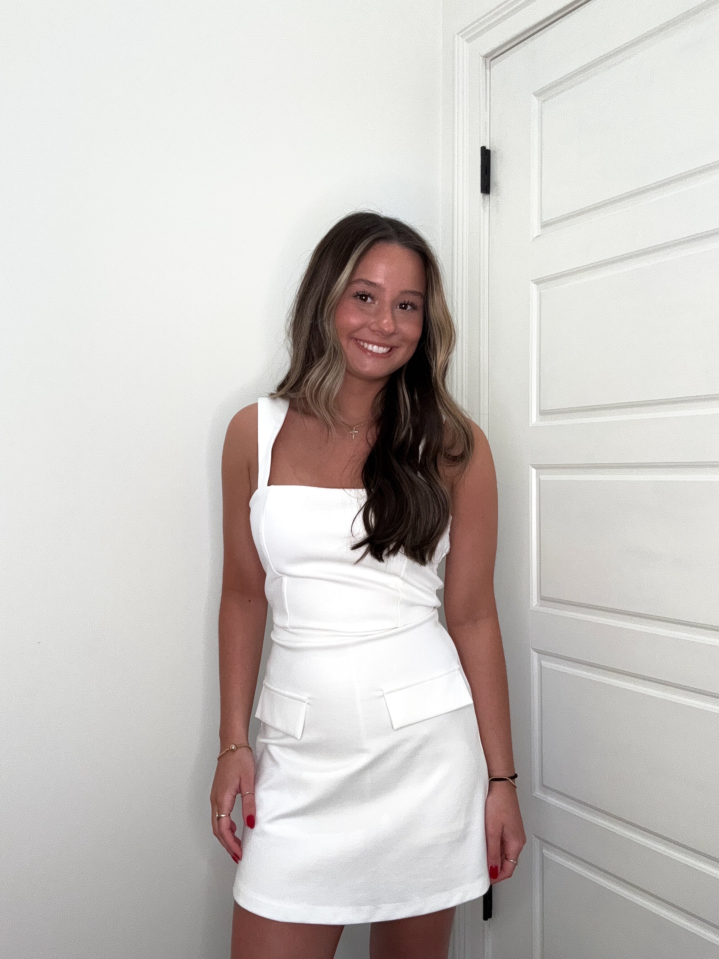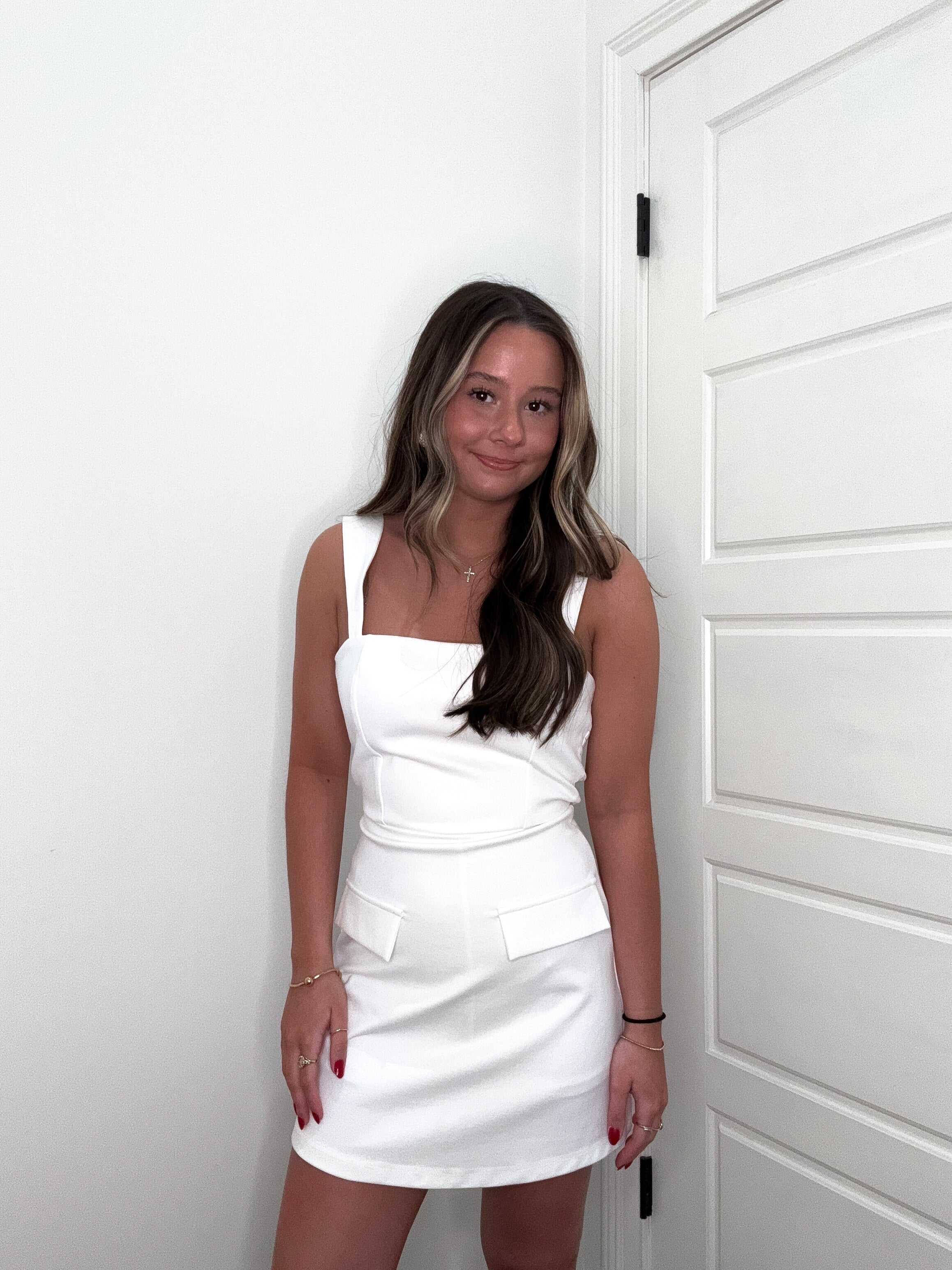Slip into effortless elegance with this crisp white romper dress. Featuring a chic square neckline and playful short silhouette, it's designed for those who love a polished look without the fuss. The faux pockets add a practical touch while keeping the streamlined aesthetic intact. Perfect for brunch dates, casual outings, or whenever you want to feel put-together and comfortable. A wardrobe essential that transitions seamlessly from day to night.