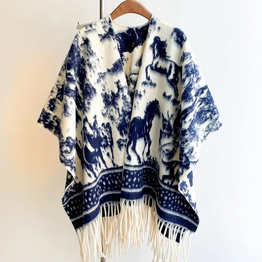 Wrap yourself in adventure with the Run Wild Shawl, a stunning blue and white design that captures the spirit of freedom and movement. Featuring charming tassels that dance with every step, this versatile shawl layers beautifully over any outfit for instant style and warmth. Perfect for those who embrace life's bold moments, whether you're heading out for an evening stroll or adding flair to your everyday look. Let your wild side shine!