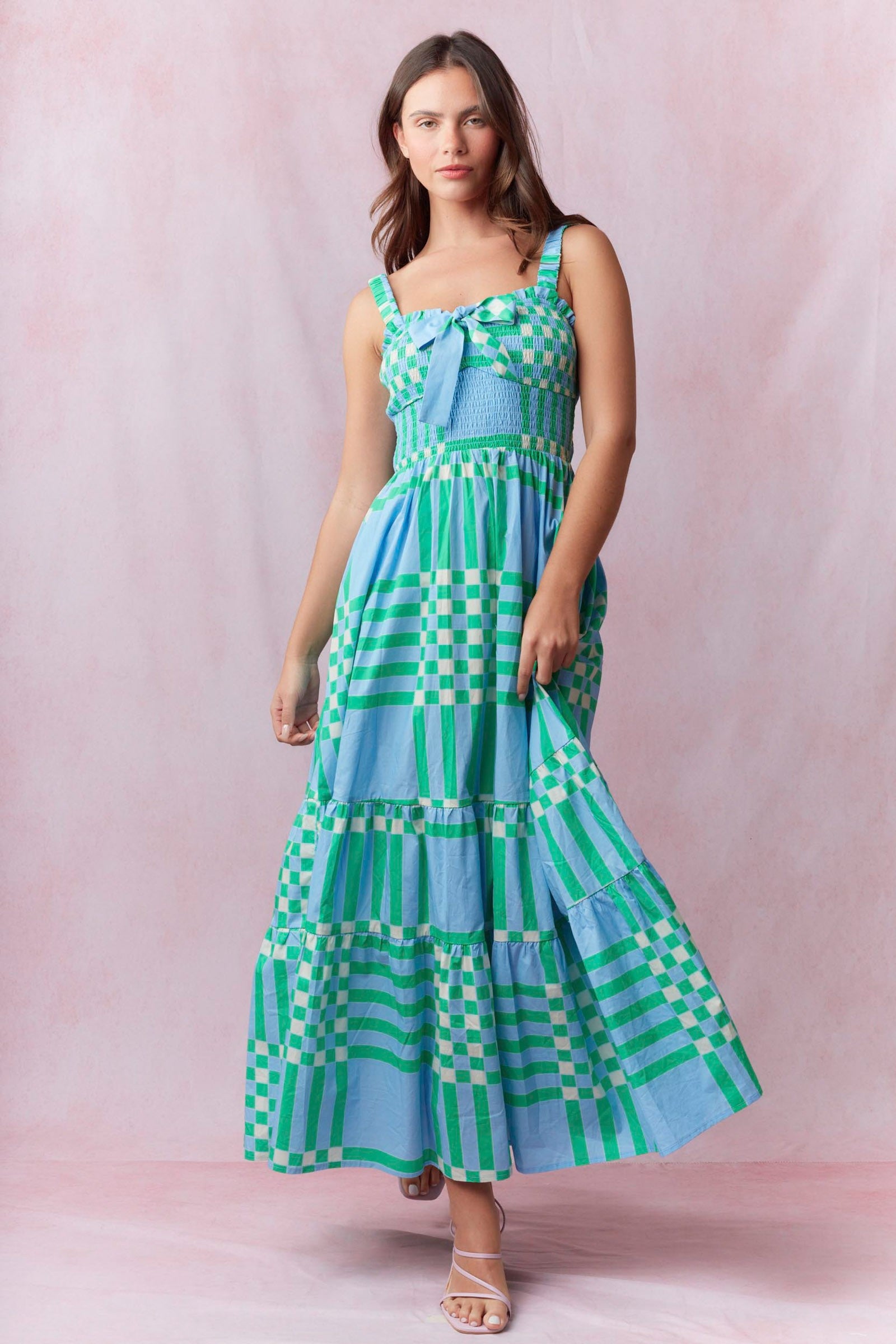 Feel carefree in our Summer Meadow Maxi Dress. This tiered dress features a playful blue and green plaid pattern, with a charming bow on the front. Perfect for a day out in the sun, it'll have you feeling like a breath of fresh air.