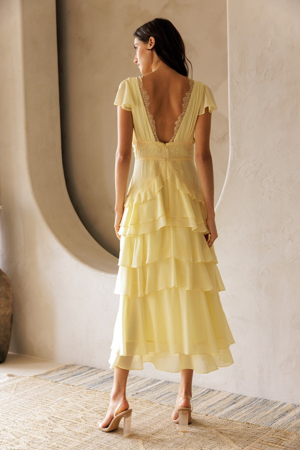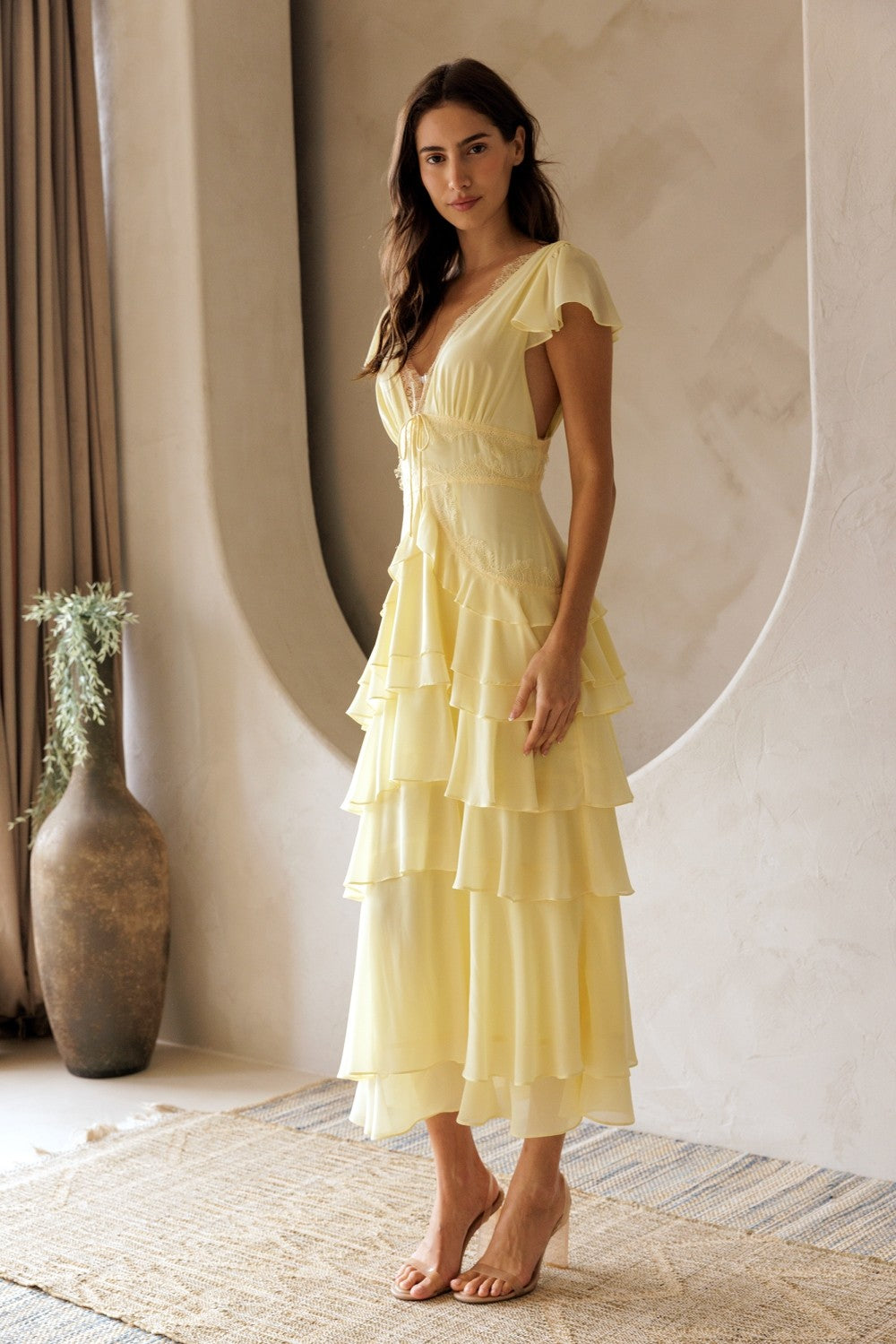 Brighten your wardrobe with the Sunshine State Maxi Dress, a cheerful yellow design perfect for warm-weather occasions. This flowing maxi features a flattering V-neckline, delicate short sleeves, and charming ruffled details that add movement and dimension. Intricate lace accents throughout elevate the look with feminine sophistication. Ideal for garden parties, beach getaways, or casual summer gatherings, this dress combines comfort with effortless style.