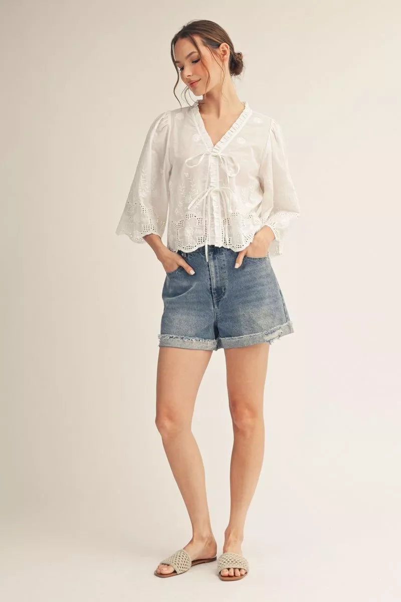 Effortless elegance meets playful style with this Sweet Threads Top. The crisp white fabric features a charming front tie detail that cinches at the waist for a flattering silhouette. Delicate embroidery adorns the three-quarter sleeves, adding a touch of feminine sophistication. Perfect for casual outings or dressed up for weekend adventures, this versatile piece transitions seamlessly from day to night.