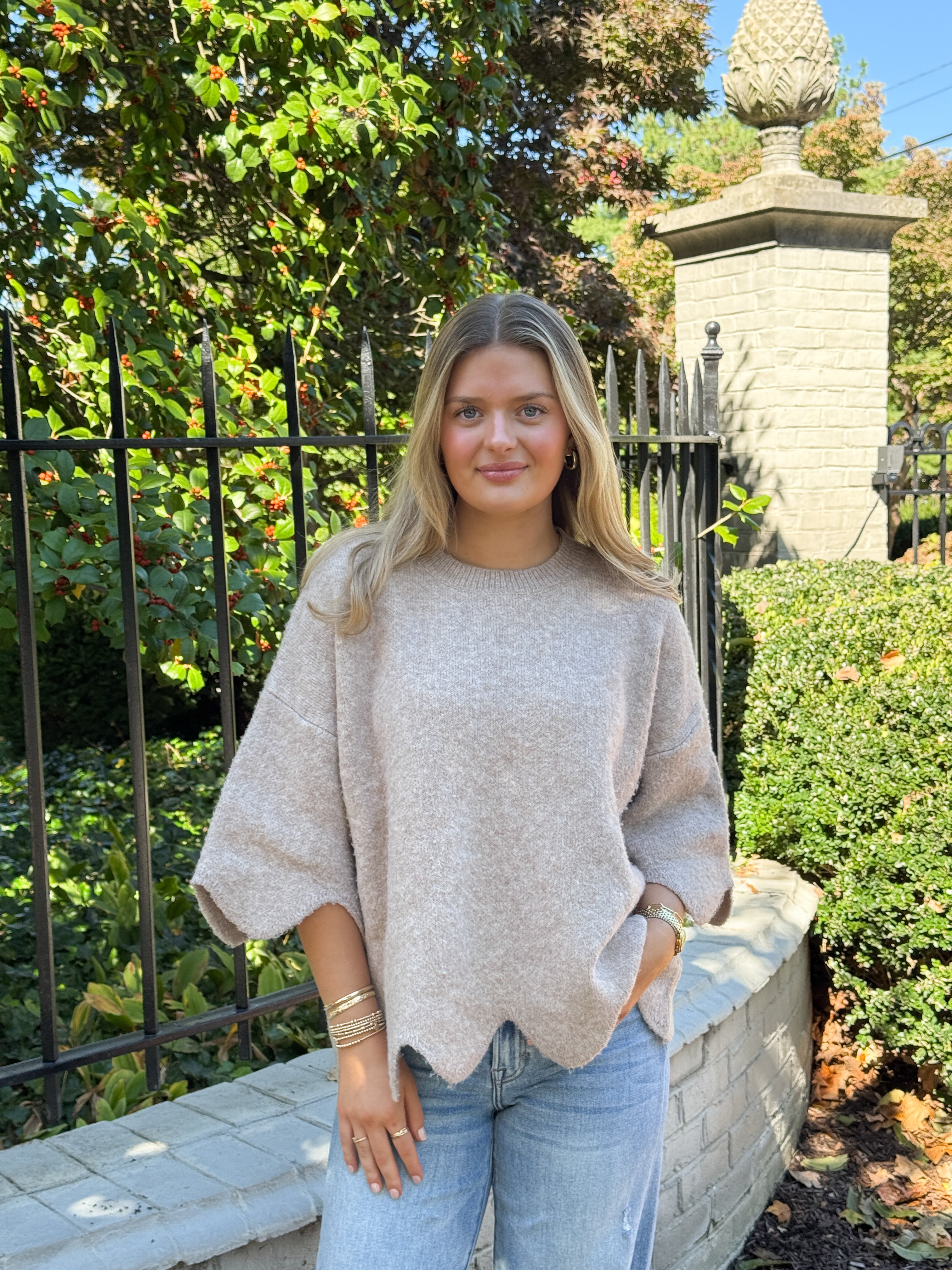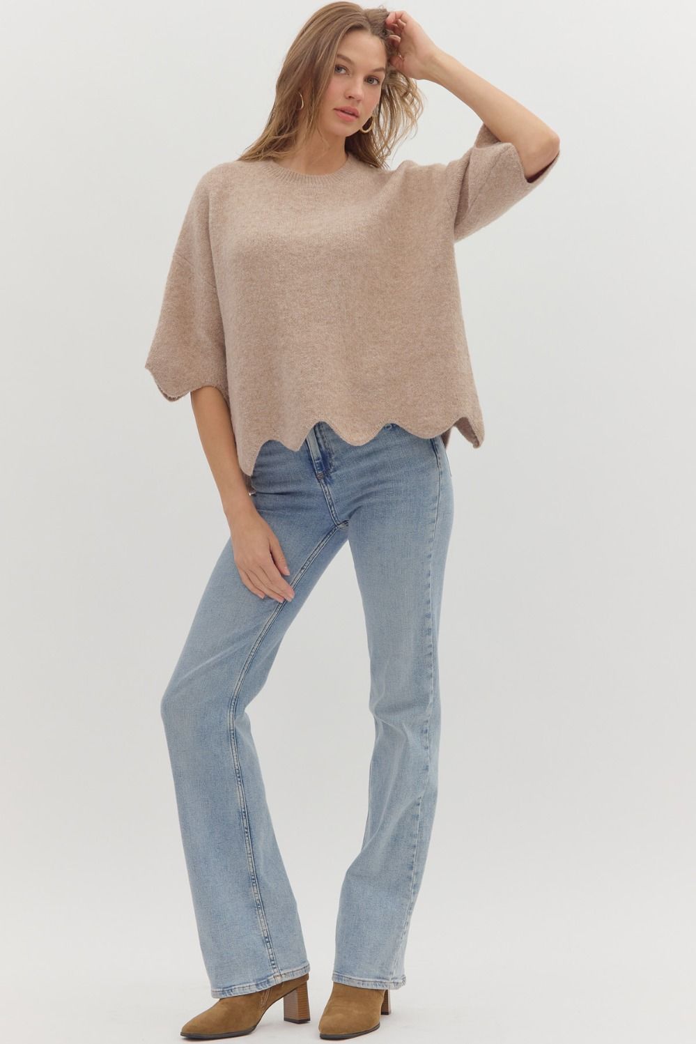 Cozy up in the Sweetie Scallop Sweater, featuring charming scalloped edges on the bottoms and sleeves in your choice of creamy ivory or warm taupe. This playful design adds a touch of whimsy to your everyday look while keeping you comfortably stylish all season long. Perfect for layering or wearing solo, it’s a sweet way to brighten your wardrobe.