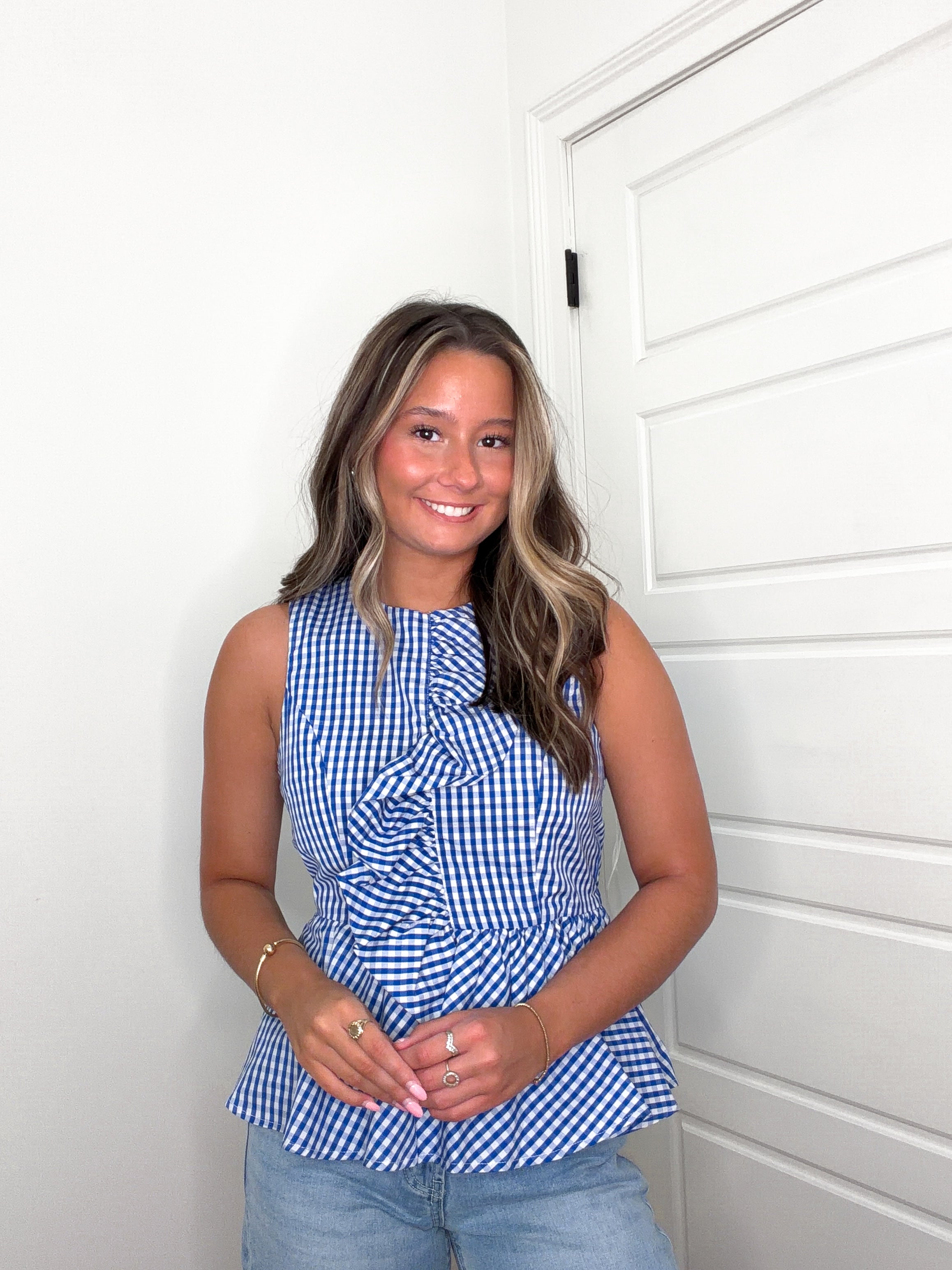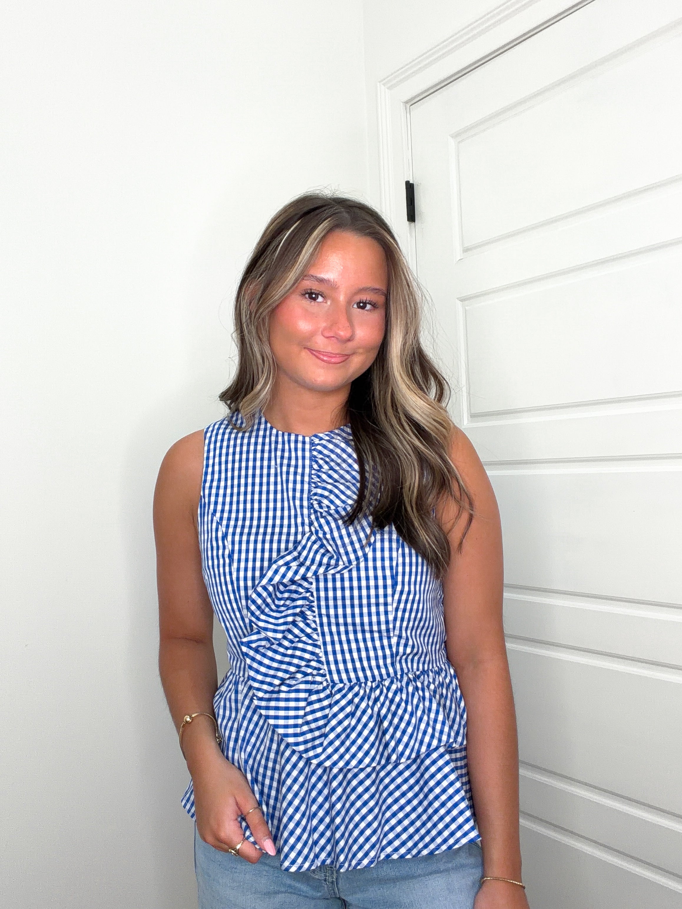 Countryside Charm Top in crisp blue and white gingham. This sleeveless peplum style features an eye-catching asymmetric ruffle at the front, adding movement and dimension. The back offers practical button closure and elasticated waist for a comfortable, adjustable fit. Fully lined and crafted from lightweight woven fabric that's non-sheer, making it perfect for layering or wearing solo. Ideal for casual outings or weekend gatherings.