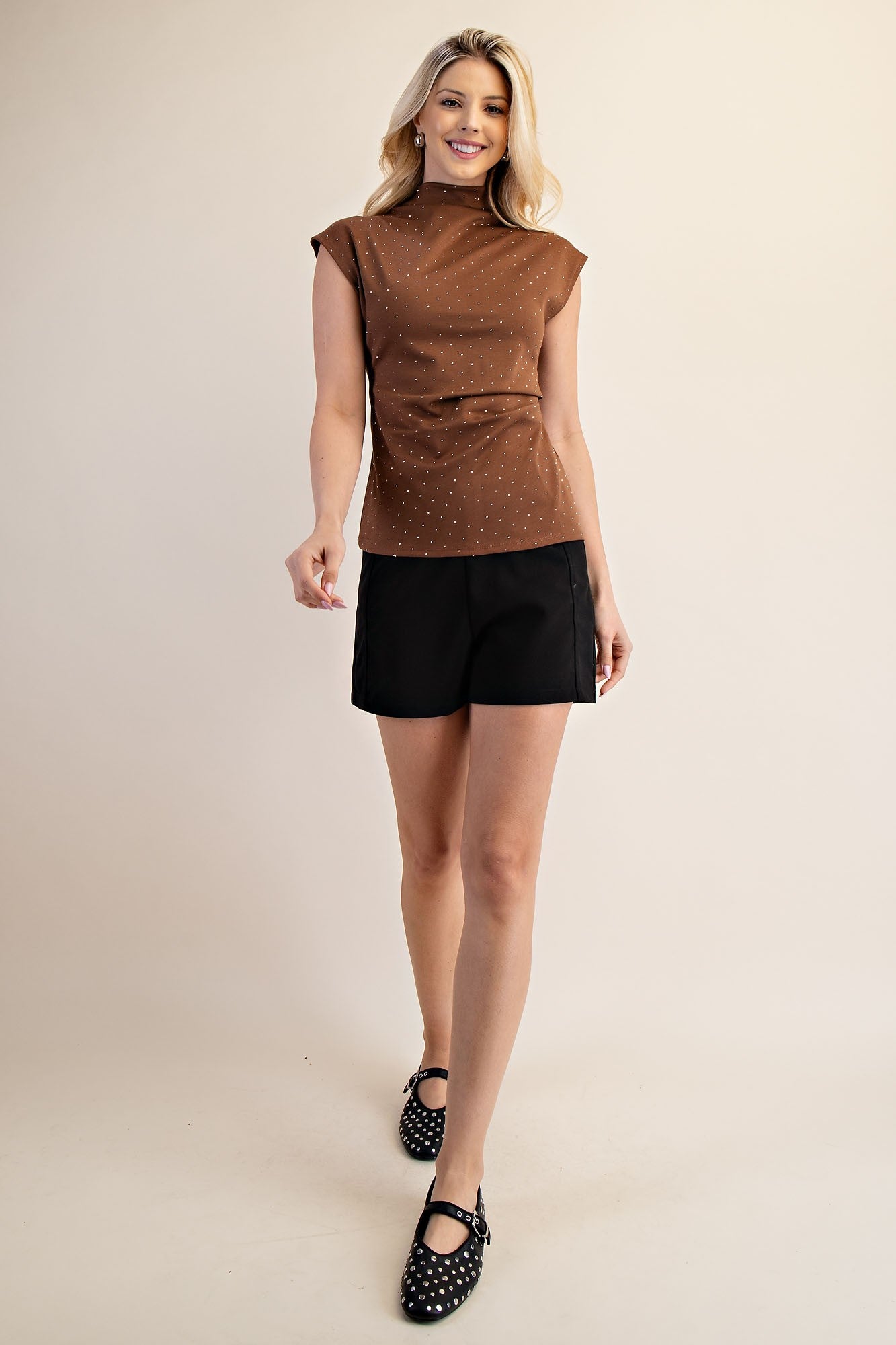 Effortlessly chic and endlessly versatile, The Every Way Top is your new go-to piece. This sleeveless mock neck top features eye-catching rhinestone embellishments that add just the right amount of sparkle to any outfit. Available in classic black or warm brown, it's the perfect canvas for layering or wearing solo. Dress it up for a night out or keep it casual—this top does it all with style and attitude.