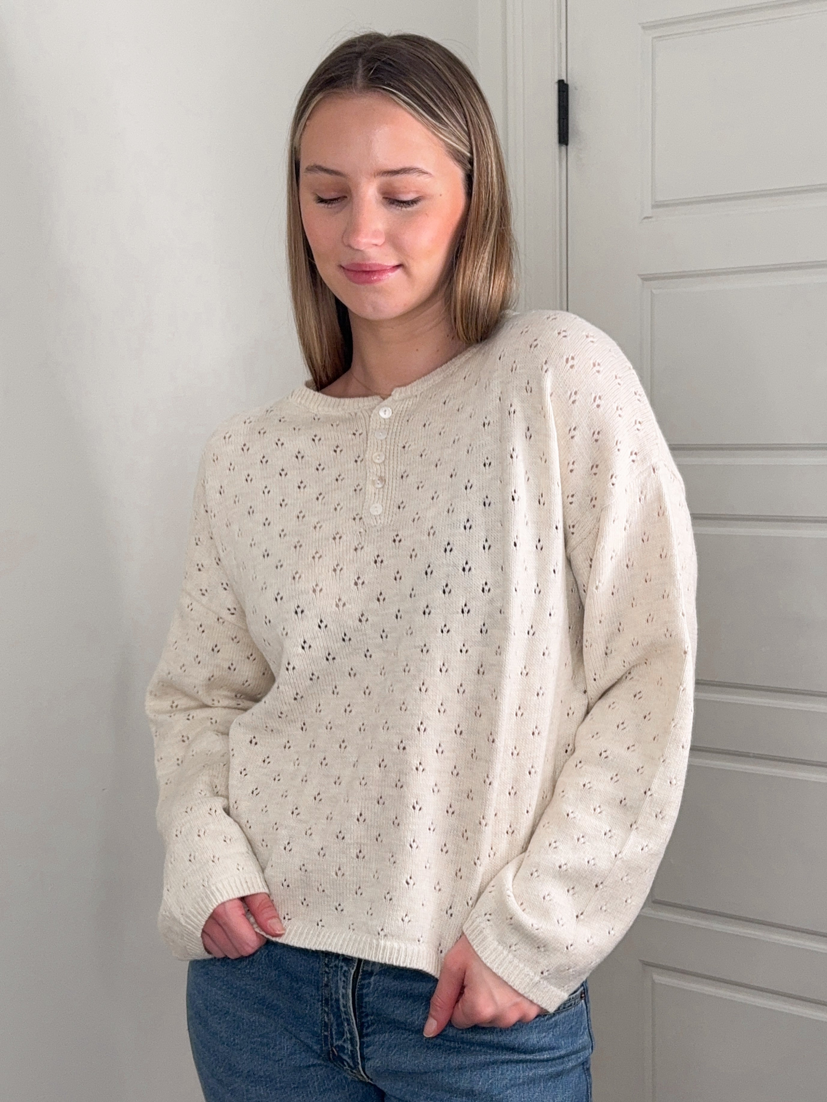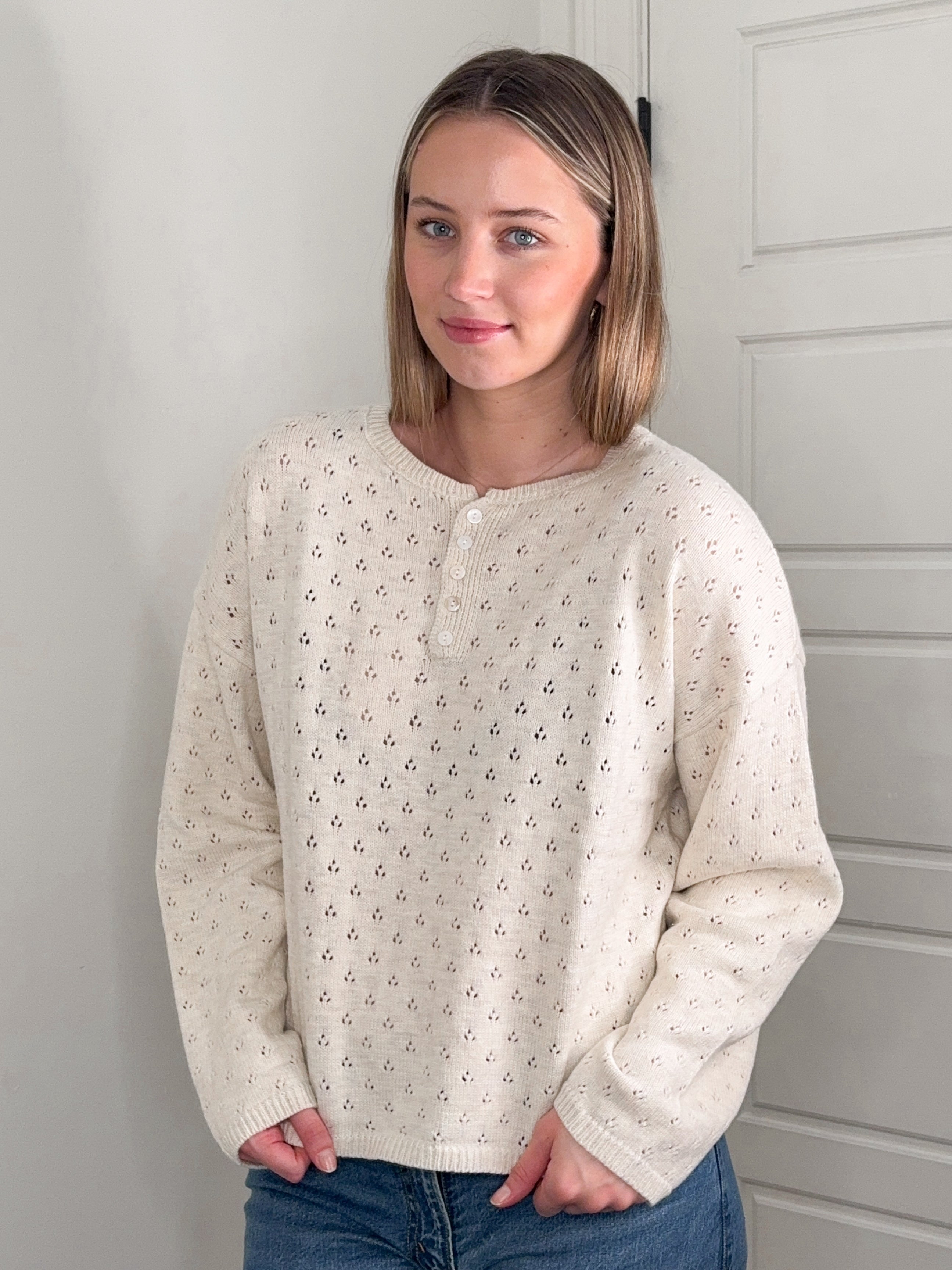 Slip into effortless comfort with The Everyday Sweater Pull Over, your new go-to layer for any occasion. This cream-colored pullover features a soft, cozy material that feels as good as it looks, complete with charming eyelet detailing and delicate white buttons at the neckline. Perfect for layering or wearing solo, this versatile sweater transitions seamlessly from casual coffee runs to relaxed weekends. Whether you're reaching for it on a chilly morning or tossing it on for an impromptu outing, this timeless piece proves that the best wardrobe staples are the ones you'll actually wear again and again.