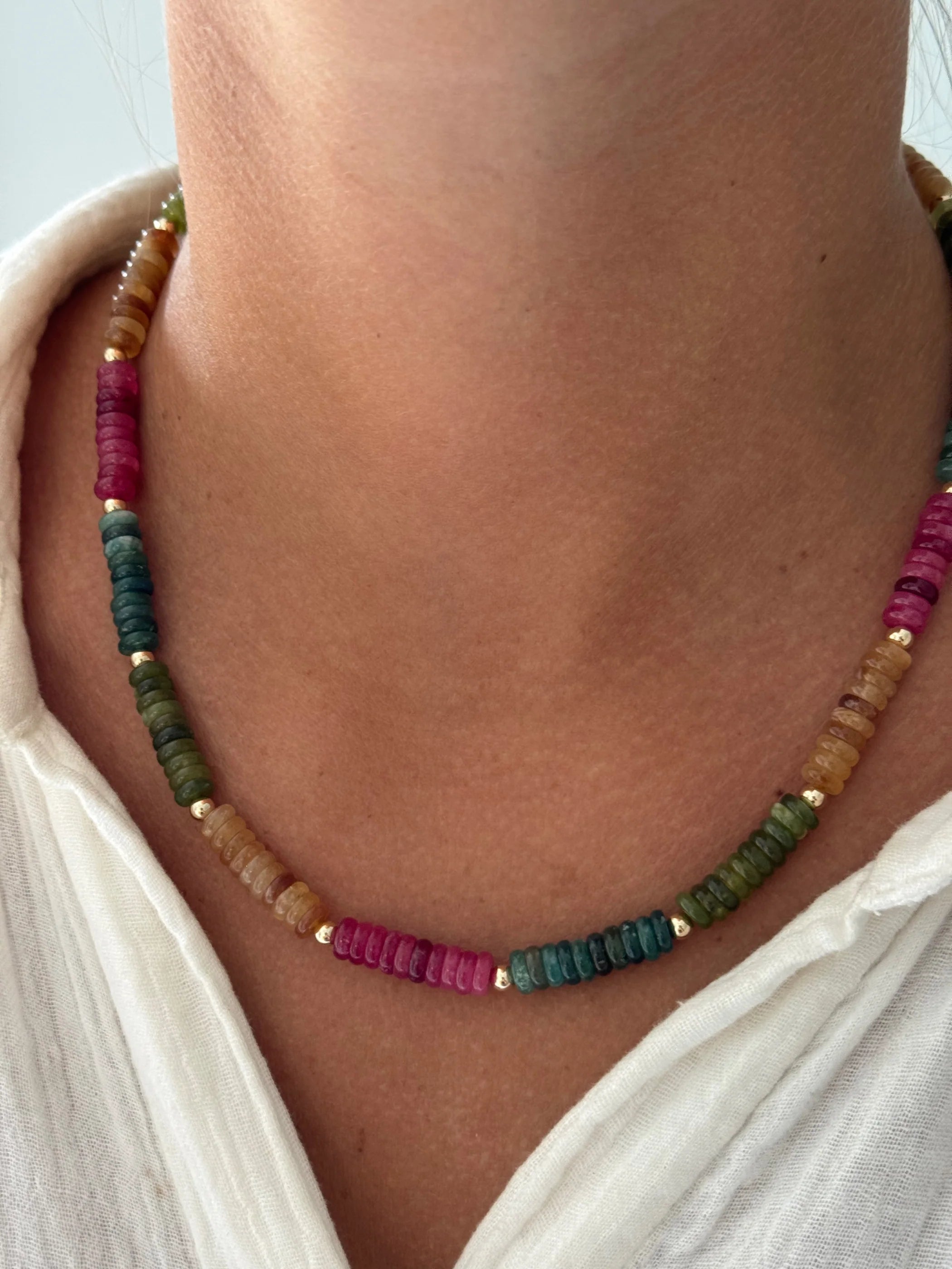 Gemstone necklace with gold beads throughout, 16in with 2in extender