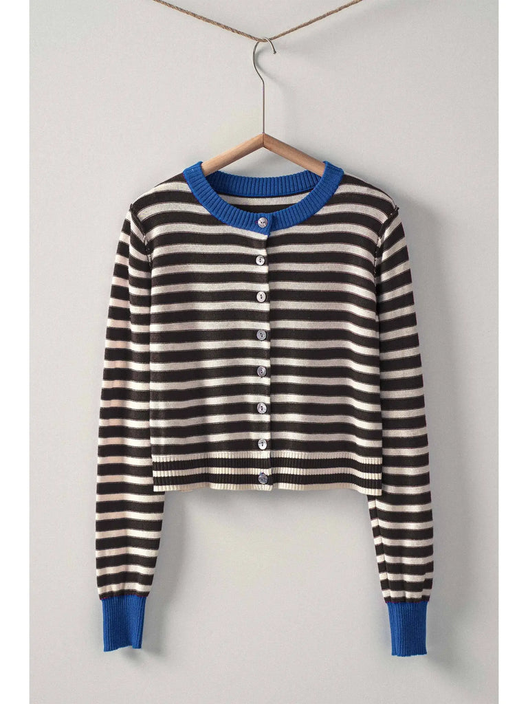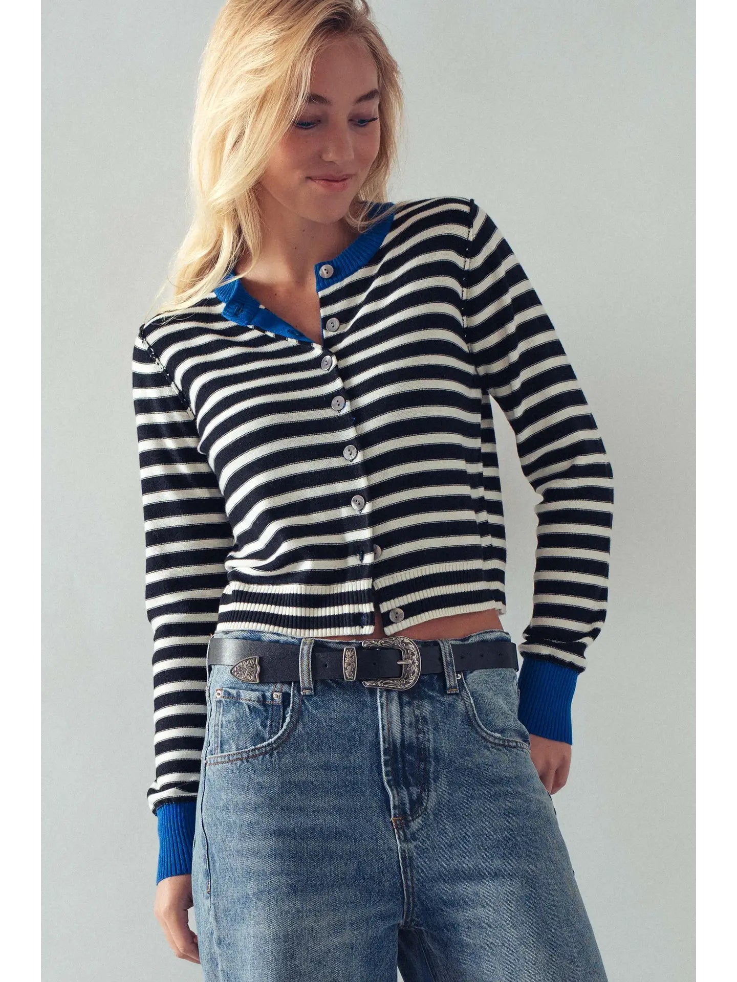 The Midnight Stripe Cardigan is your new go-to for effortless cool. This cropped button-up features bold black and white stripes that pop against a charming blue collar, giving you that perfect blend of classic and contemporary. The soft knit fabric drapes beautifully while the cropped silhouette flatters every frame. Whether you're layering over a dress or pairing with your favorite tee, this cardigan brings instant personality to any outfit. Cozy, chic, and undeniably fun.