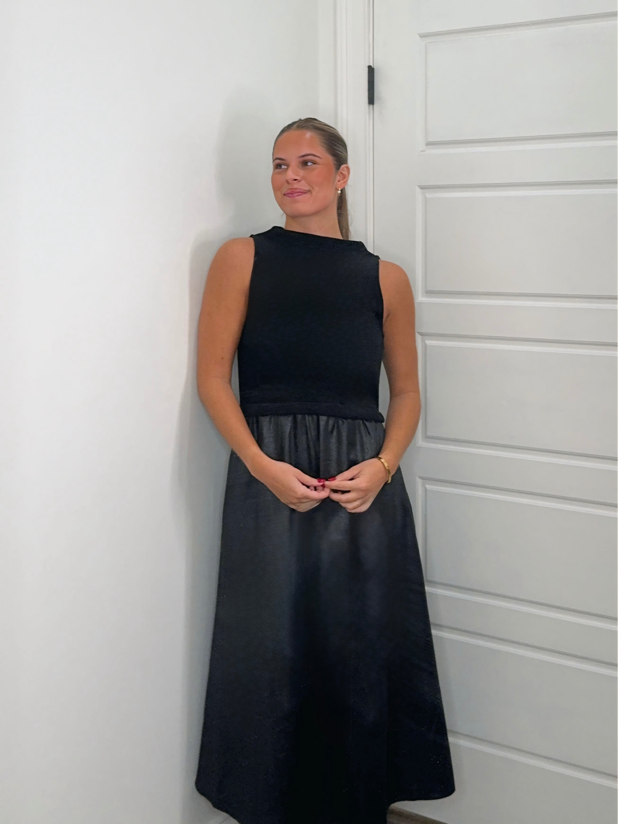 Step out in style with The Night Spark Dress—a playful twist on classic elegance. The sleeveless, high-neck knit top offers cozy comfort while the sleek fake leather maxi skirt adds a bold, edgy vibe. Perfect for dancing the night away or turning heads at any event, this dress combines softness and shine for a look that’s both fun and fierce.