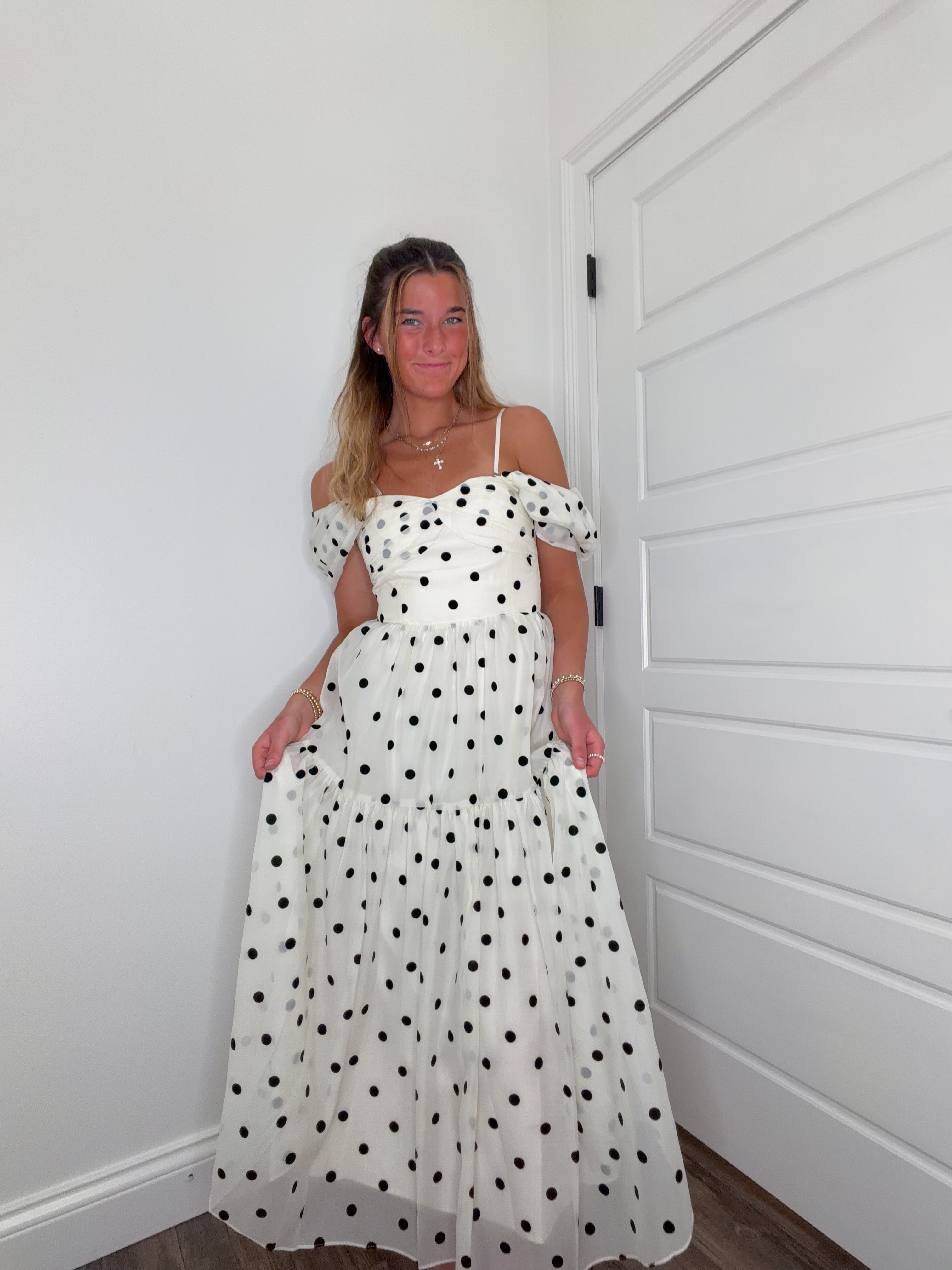 Effortless elegance meets playful charm with the Polka Belle Dress. This cream off-the-shoulder design features classic black polka dots for a timeless look that transitions seamlessly from day to night. The relaxed off-shoulder neckline adds a touch of sophistication while maintaining a breezy, approachable style. Perfect for warm weather gatherings, casual outings, or whenever you want to feel confident and chic. A versatile wardrobe essential that pairs beautifully with sandals, heels, or sneakers.