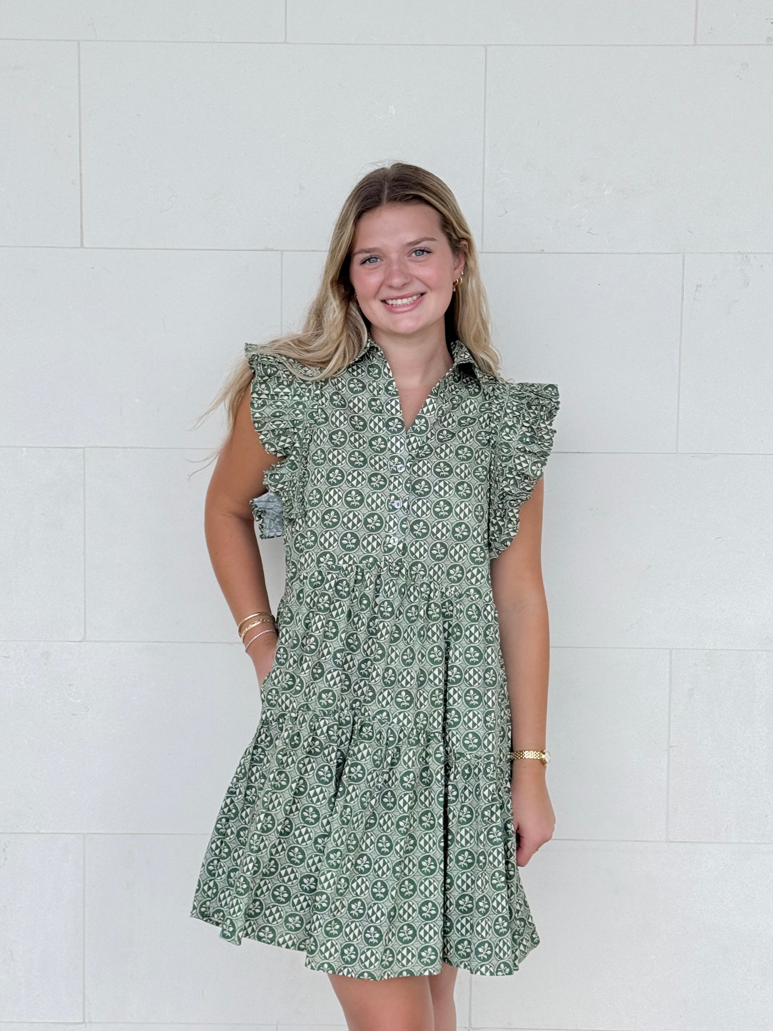 The Quiet Garden Dress is a playful favorite, featuring flutter sleeves and a short length that’s perfect for sunny days. Choose between green or navy, both adorned with a charming white circular pattern. With buttons down half the front, this dress adds a fun twist to your everyday style.