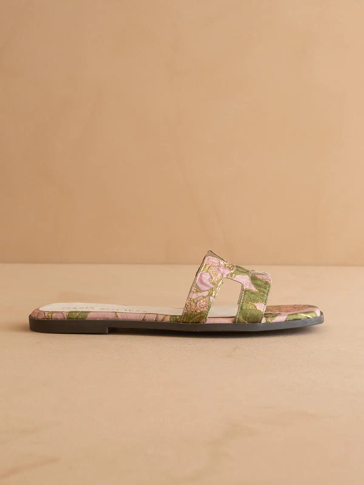 Step into a blooming paradise with The Rose Garden Sandal. This charming pink sandal features delicate pink flowers and verdant green leaves dancing across the design, accented with shimmering gold details on top. Perfect for those who love nature-inspired style with a touch of sparkle, these sandals bring garden-fresh elegance to every step. Whether you're strolling through town or heading to a special occasion, let your feet blossom in botanical beauty.