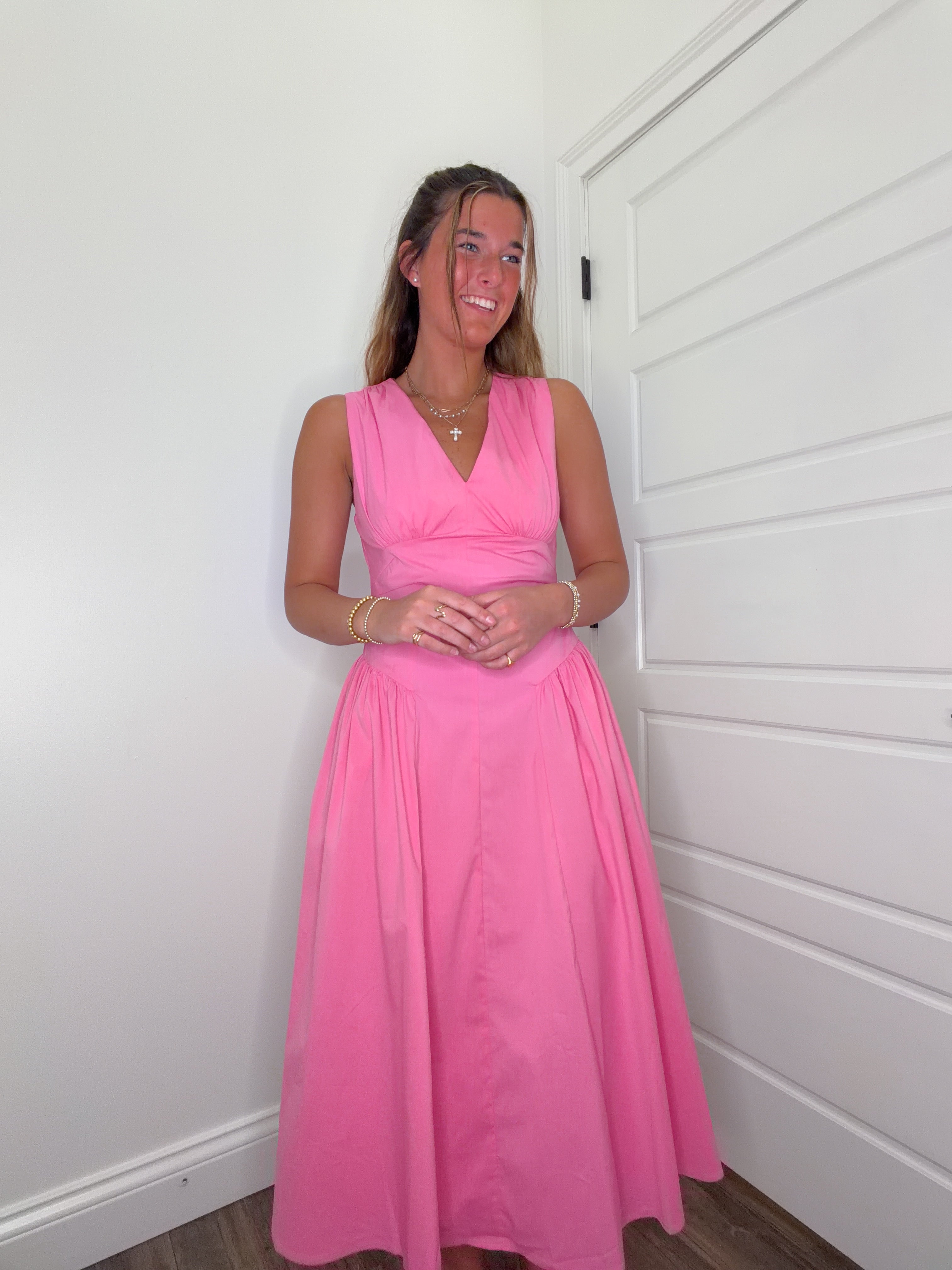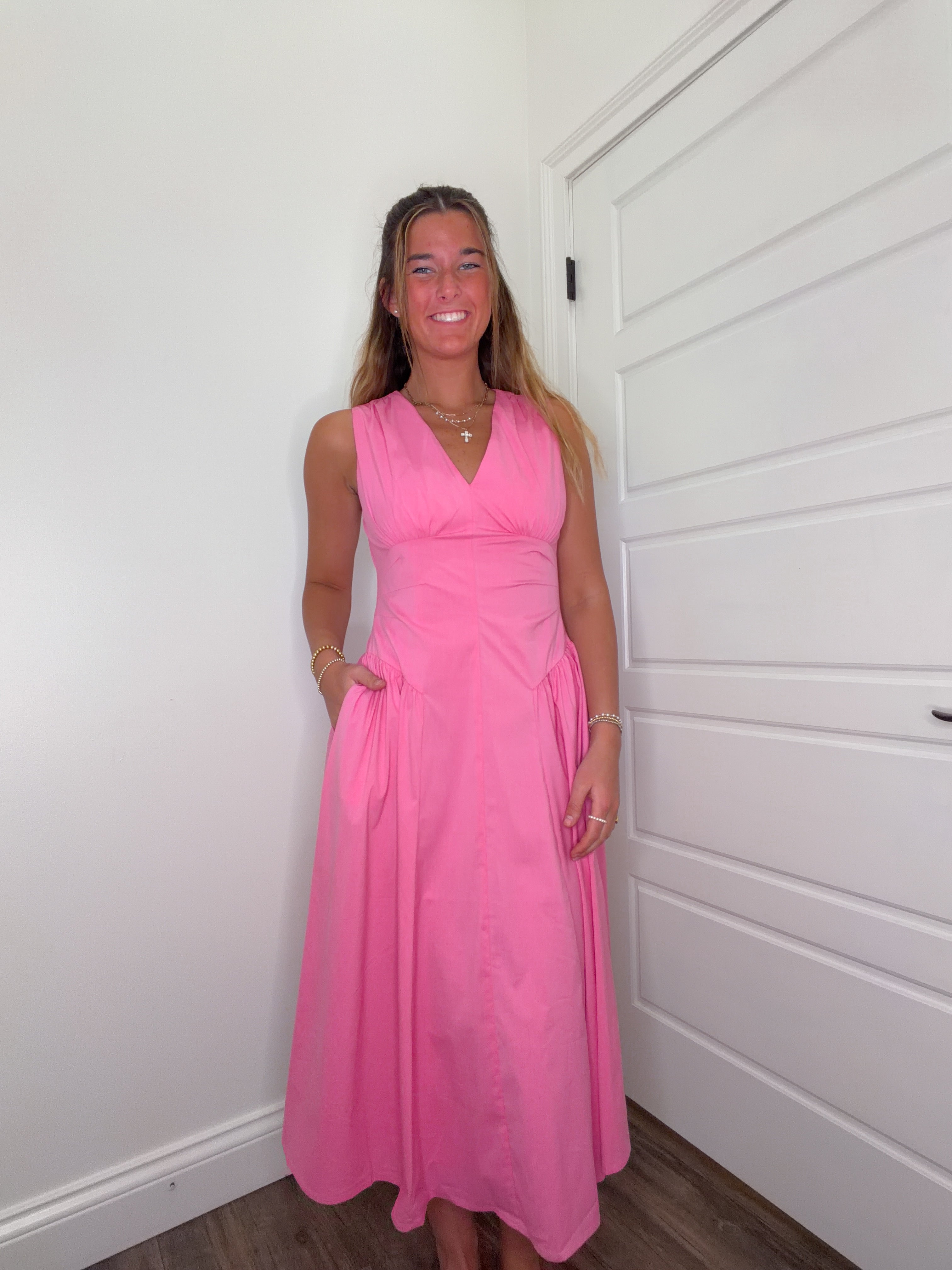 The Rosy Drop Dress features a charming drop waist silhouette that flatters the figure with effortless elegance. Crafted in a soft pink hue, this dress showcases a distinctive off-the-shoulder neckline and cut-off sleeves for a modern, playful twist. Perfect for spring gatherings, casual outings, or any occasion calling for feminine style with contemporary flair. The relaxed drop waist creates a graceful line while maintaining comfort throughout the day.
