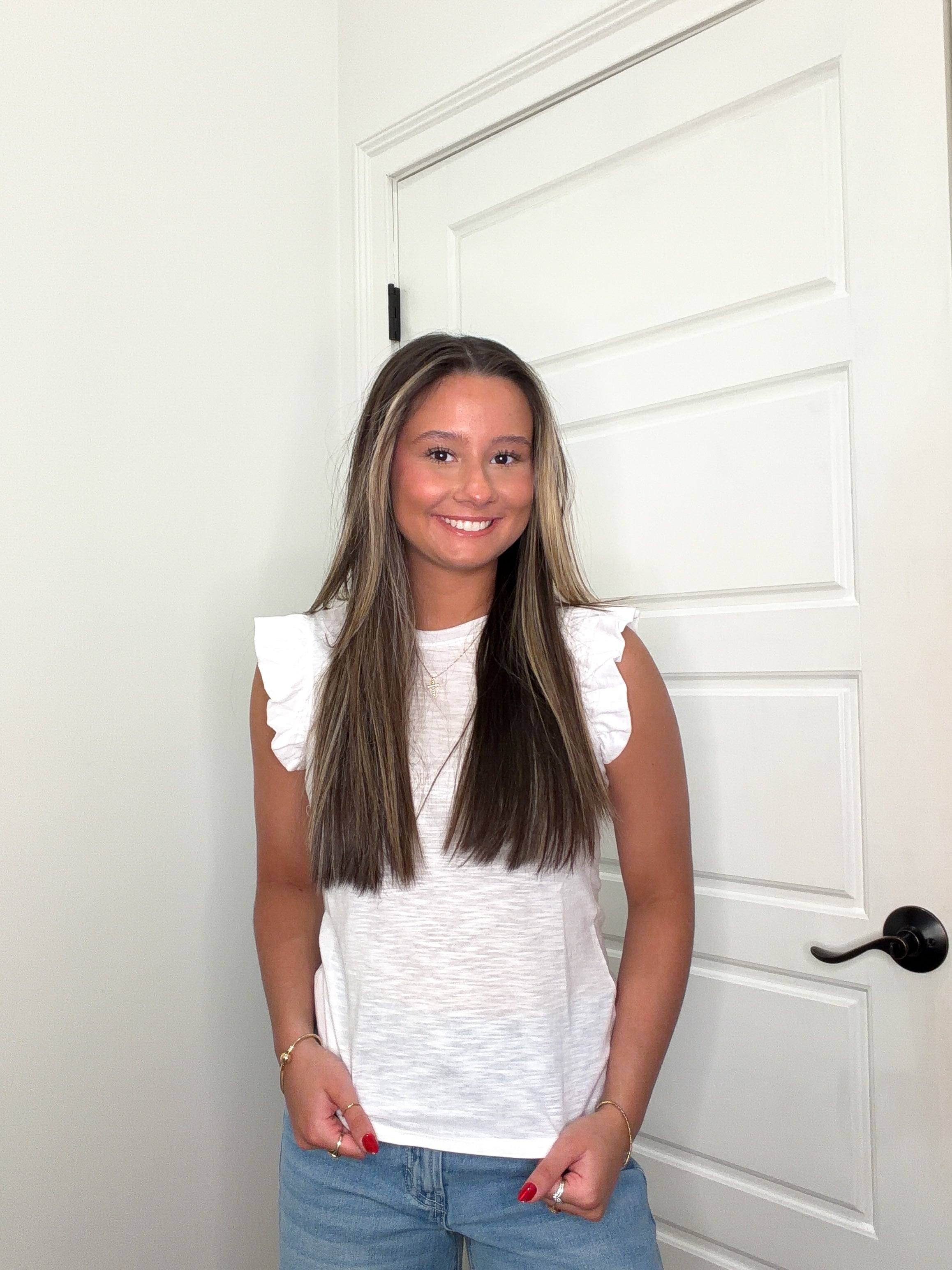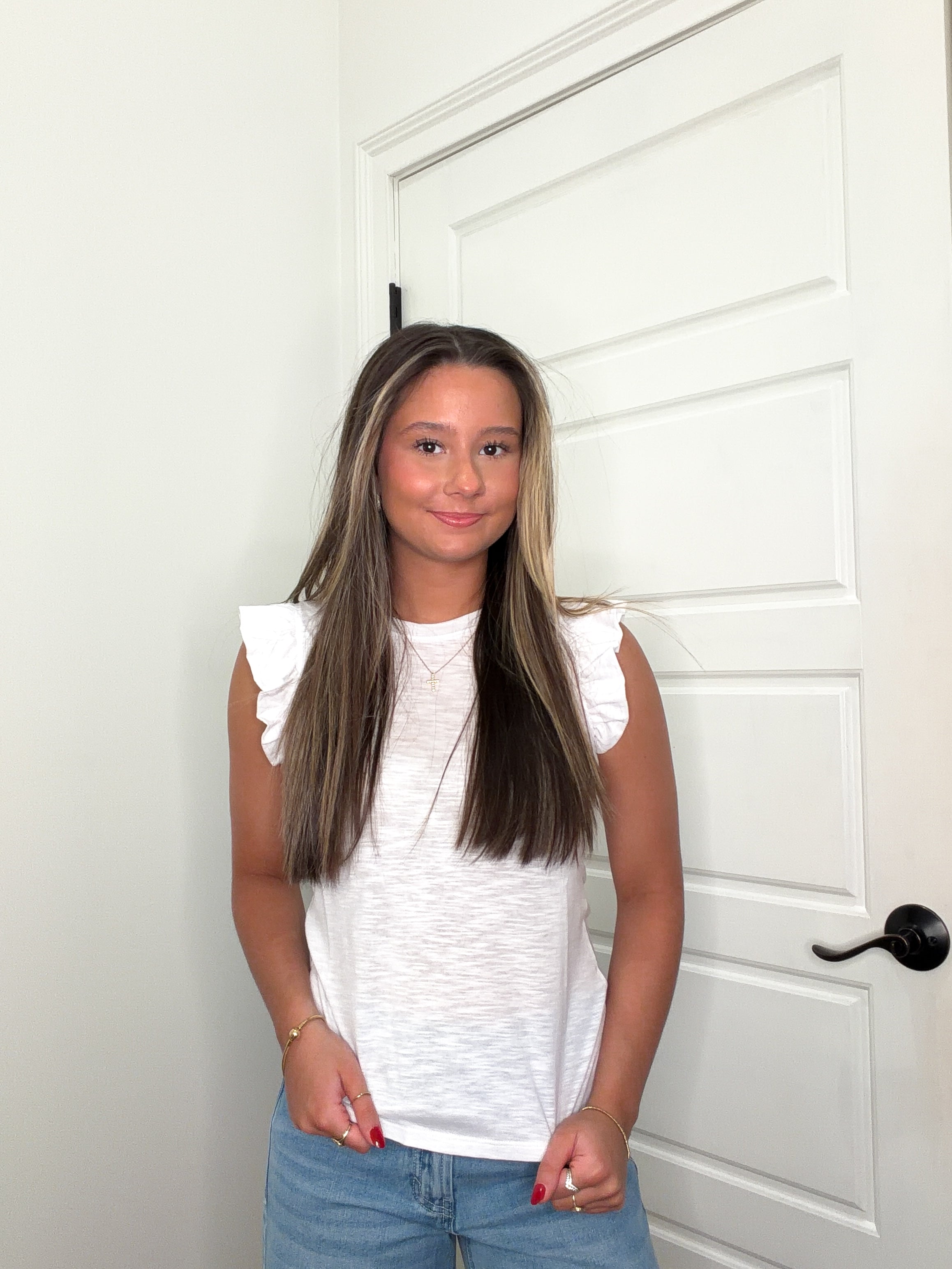 Embrace effortless style with The Ruffle Cloud Tank, a breezy essential that floats between casual and chic. Crafted in soft white fabric, this tank features delightfully ruffled cuff sleeves that add a touch of whimsy to any outfit. Perfect for layering over your favorite tee or wearing solo on warm days, it's the versatile piece your wardrobe has been waiting for. Light, airy, and undeniably charming—your new go-to for looking put-together without trying too hard.