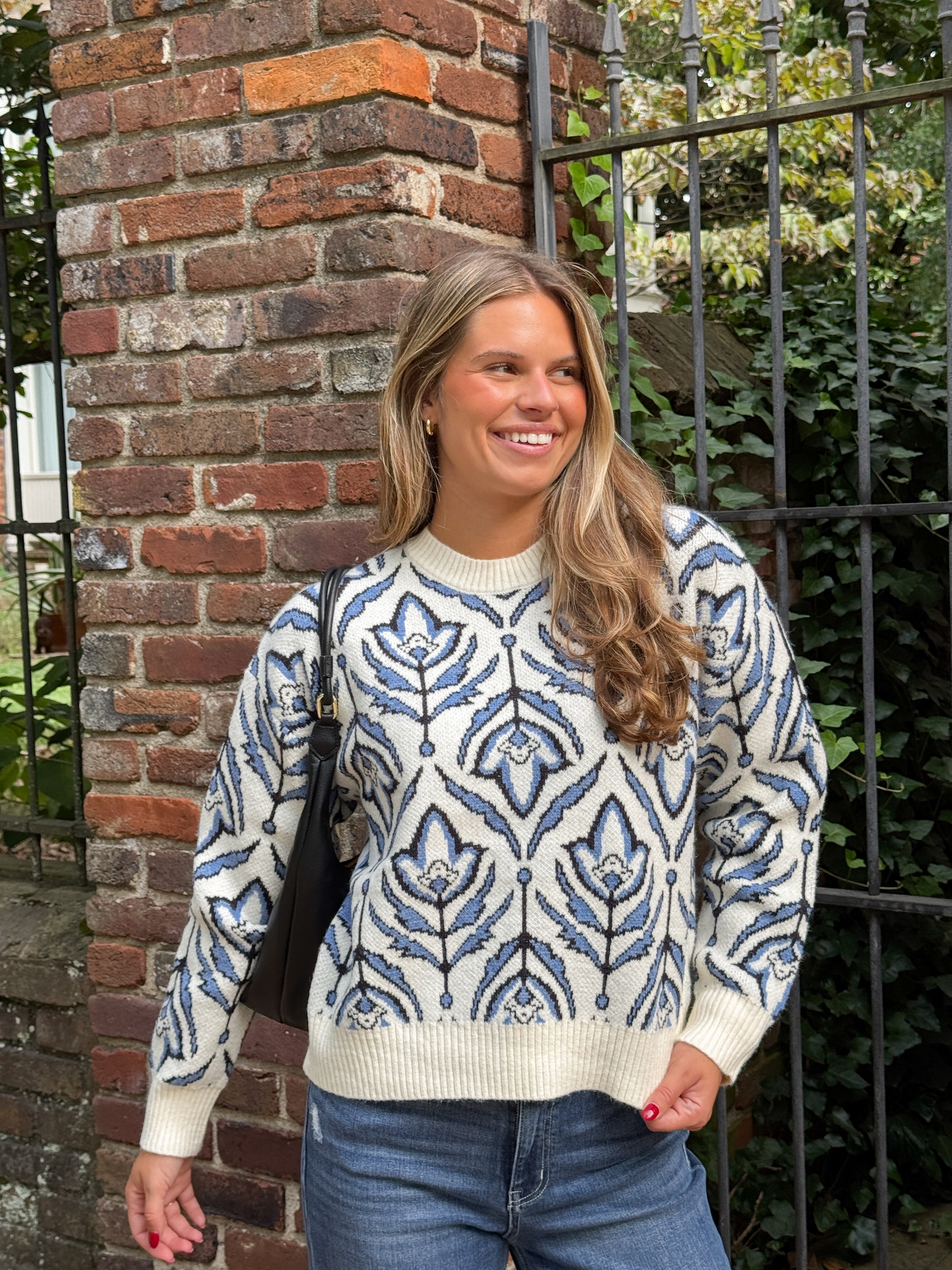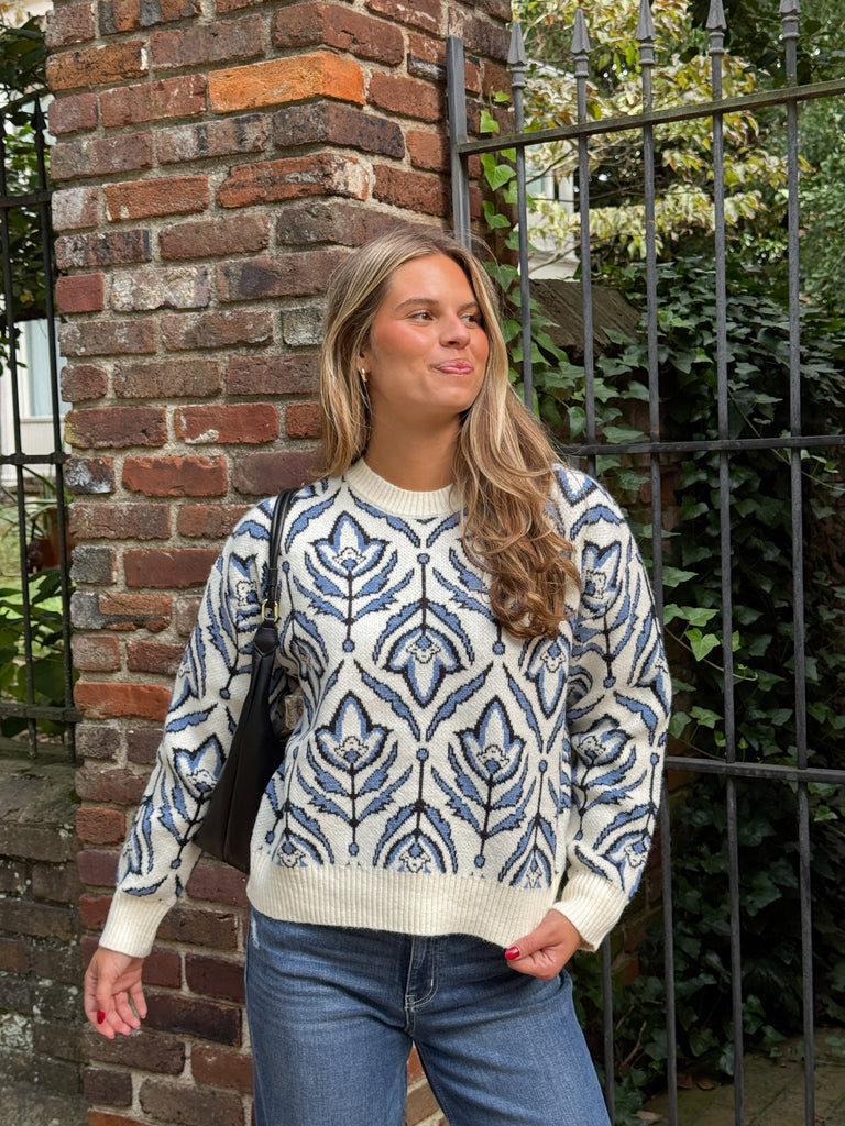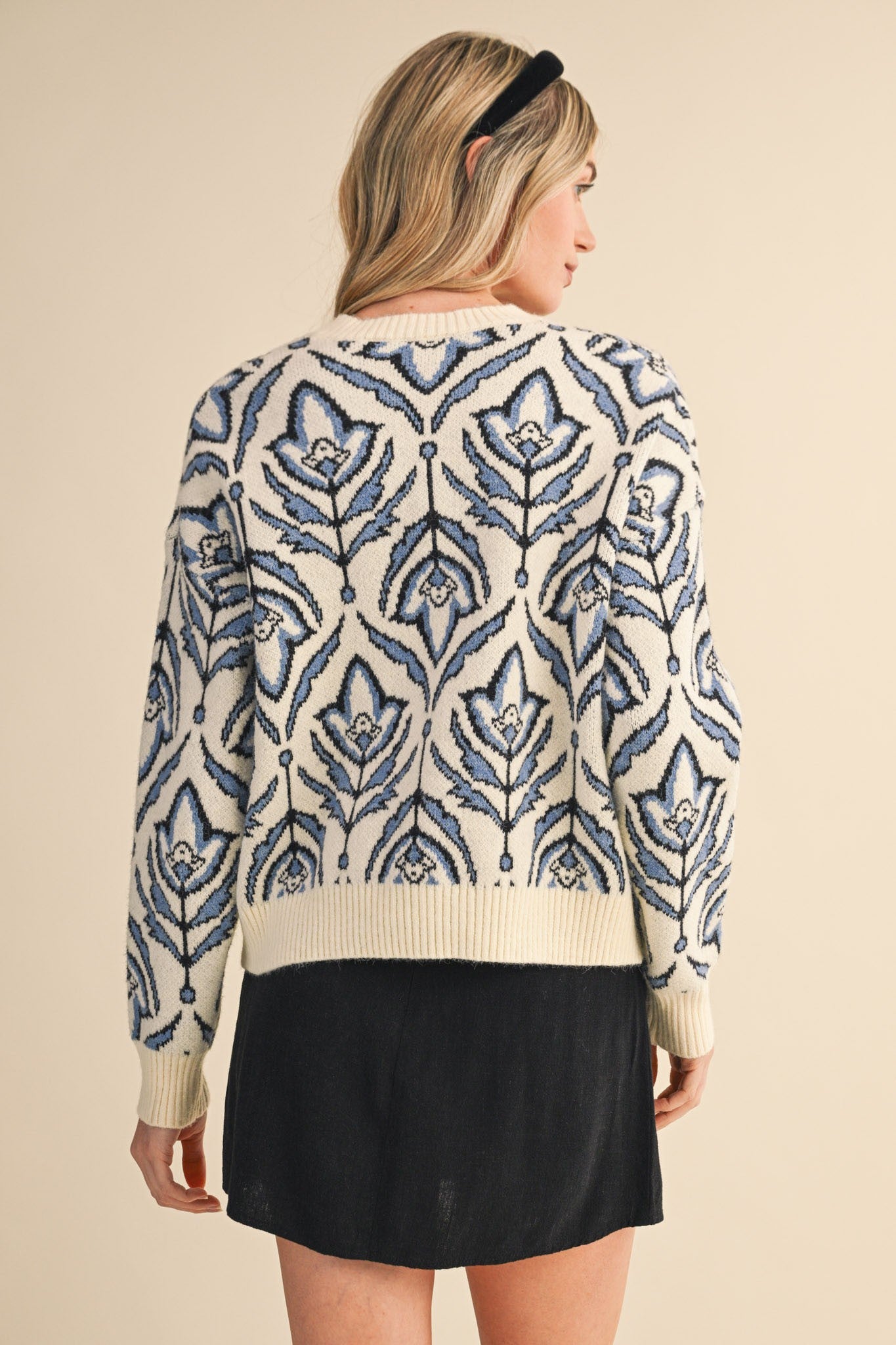 Cozy meets charming with The Soft Stitch Knit Sweater. Featuring a delightful all-over floral knit in blue and black on creamy fabric, this pullover brings playful style to your wardrobe. The ribbed round neckline, hem, and cuffs add a snug touch, while drop shoulder long sleeves and a relaxed fit keep comfort front and center. Perfect for adding a splash of fun to any chilly day!
