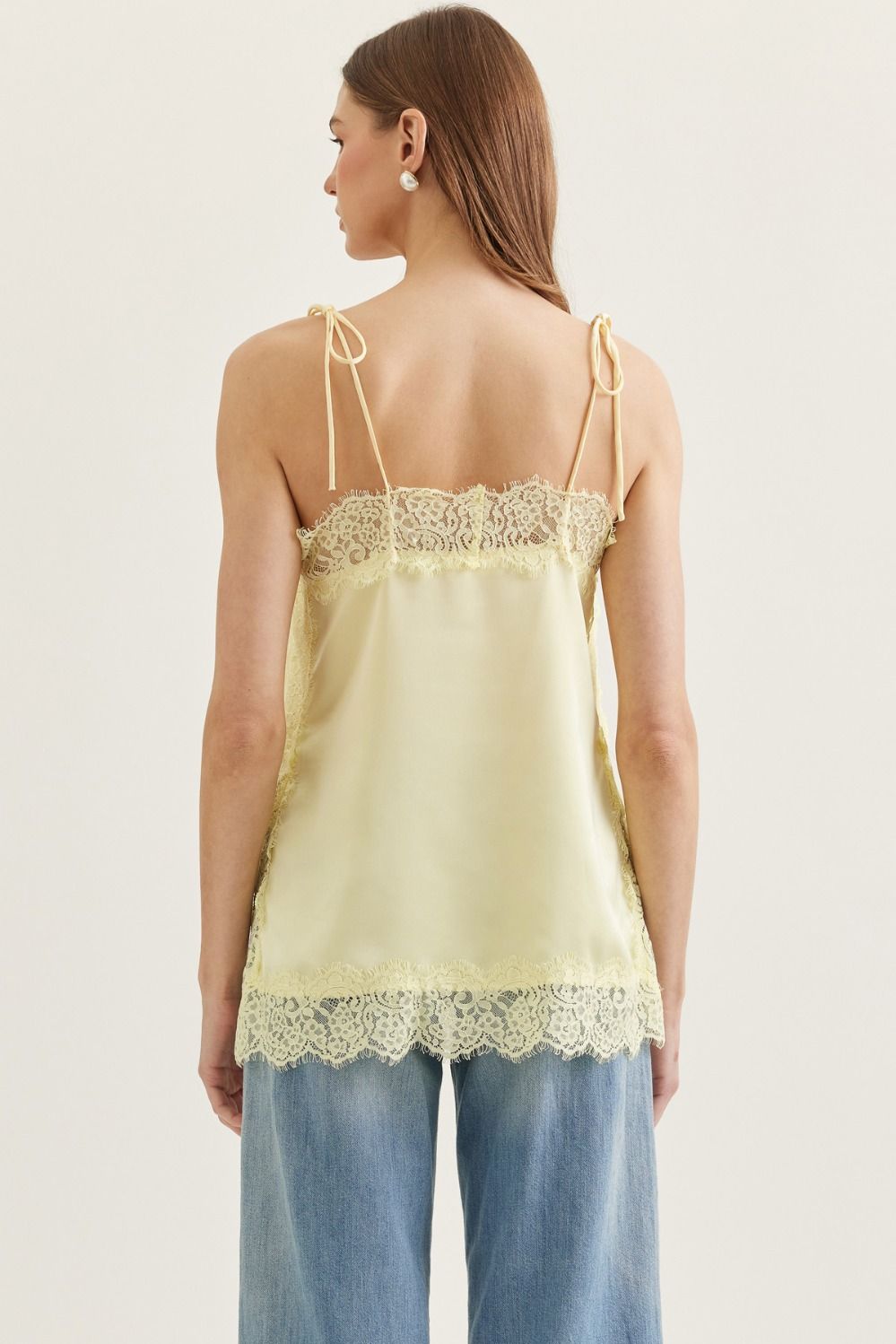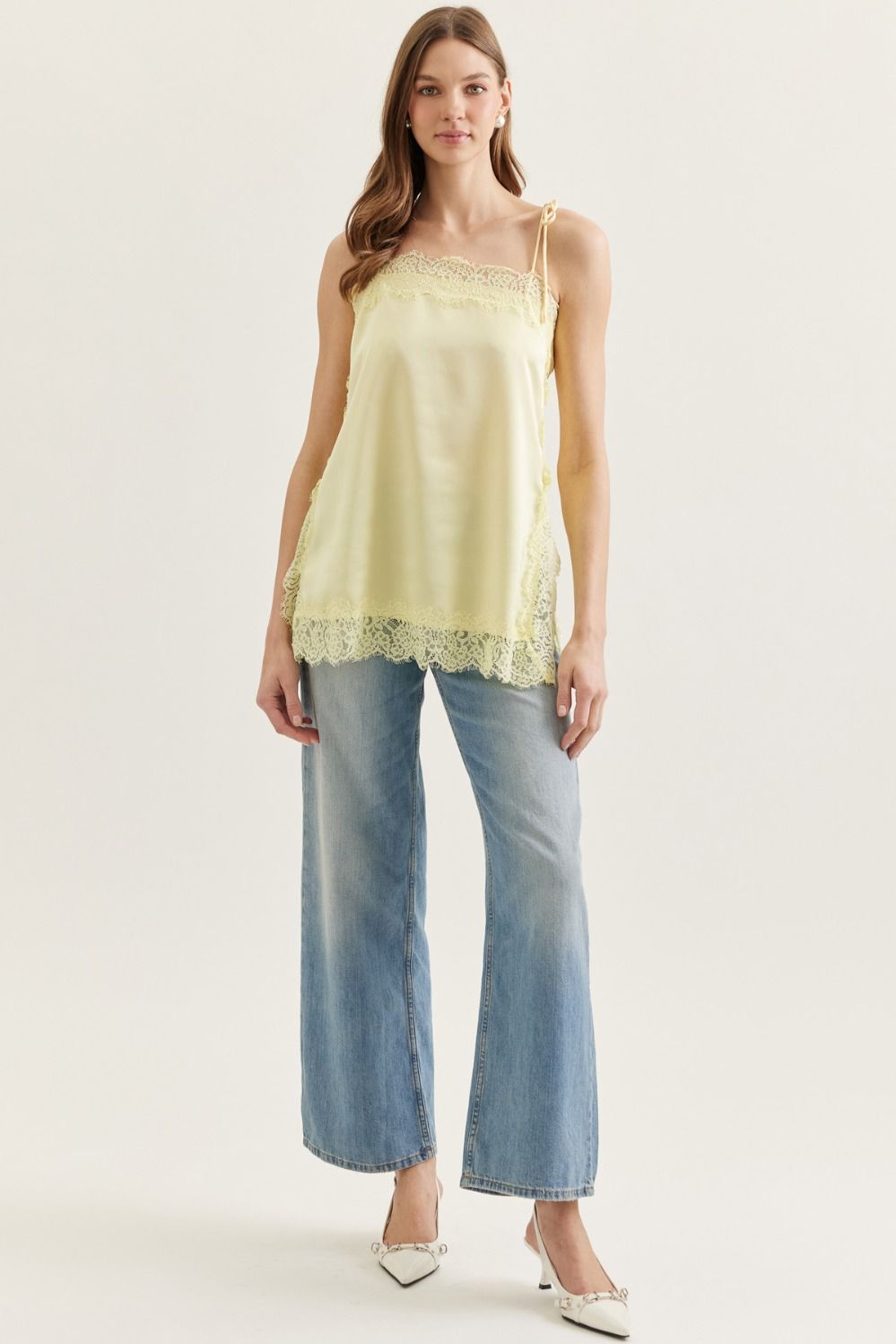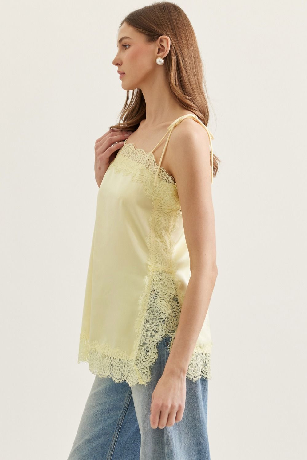 Brighten your wardrobe with the Sunbeam Lace Top, a versatile sleeveless cami designed for effortless style. Delicate lace trim frames the neckline, while adjustable self-tie shoulder straps let you customize the fit. A subtle side slit adds movement and dimension to this lightweight, woven piece. Crafted from non-sheer fabric and left unlined for breathability, it's perfect for layering or wearing solo. The cheerful yellow hue brings warmth to any outfit, making it an ideal choice for spring and summer days.