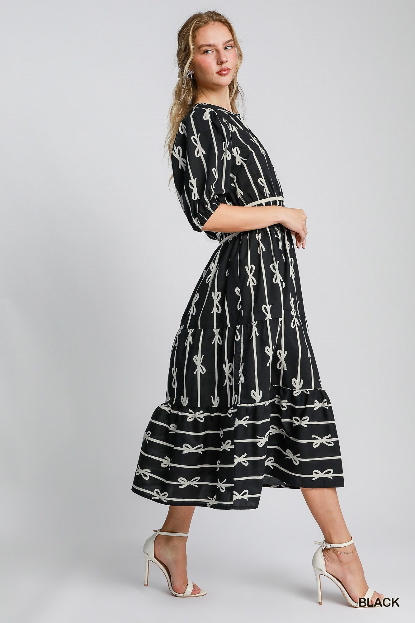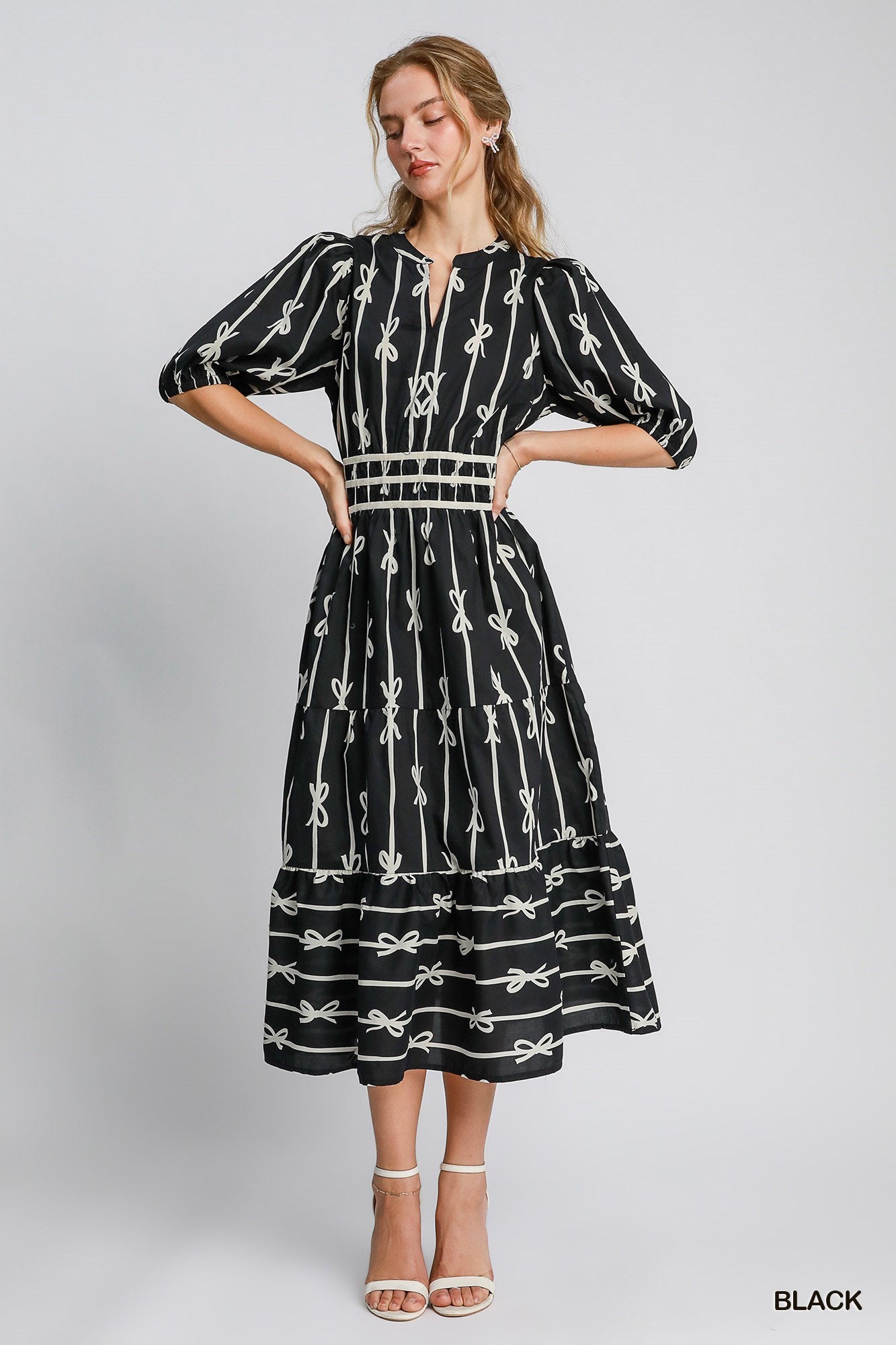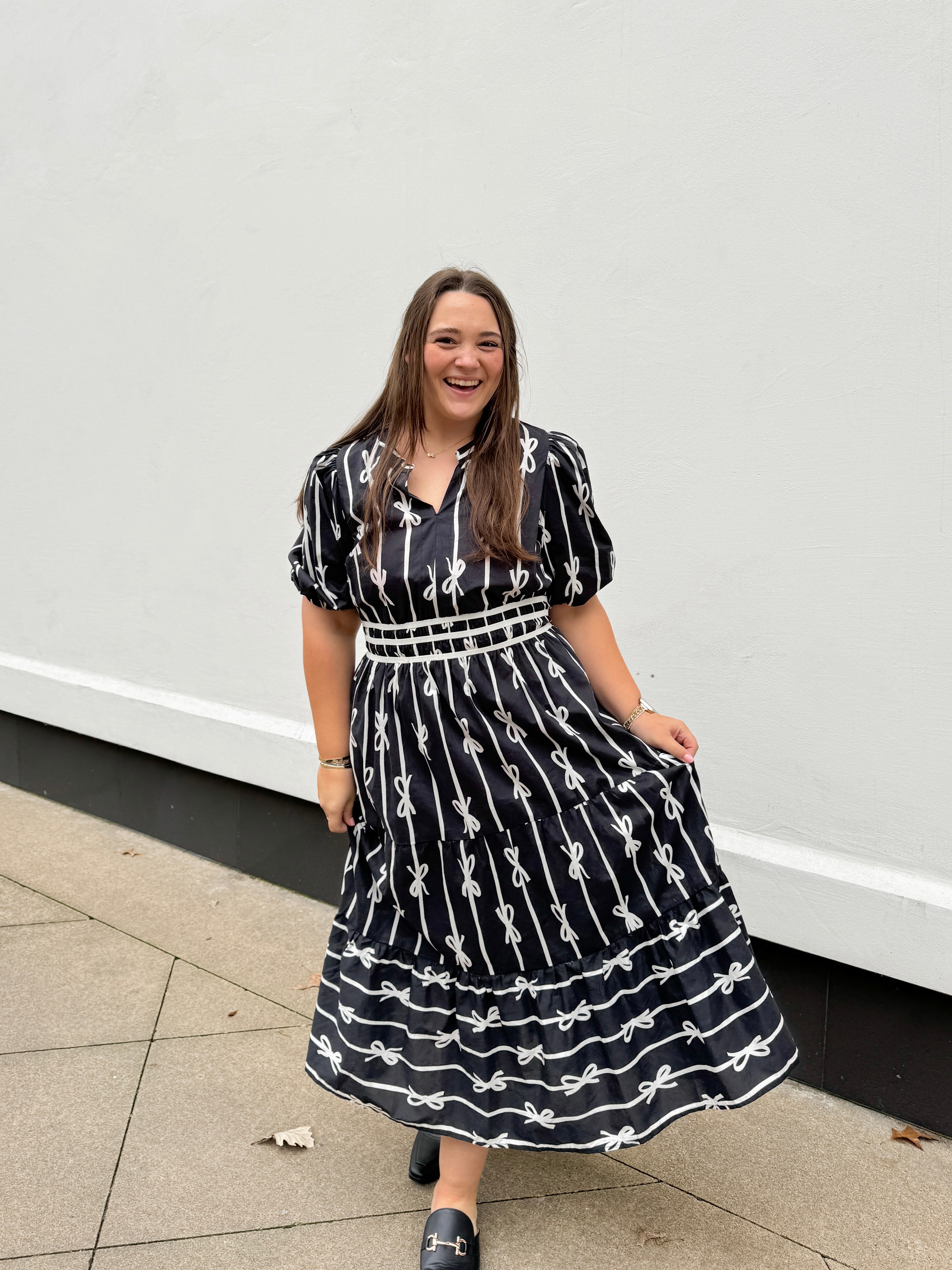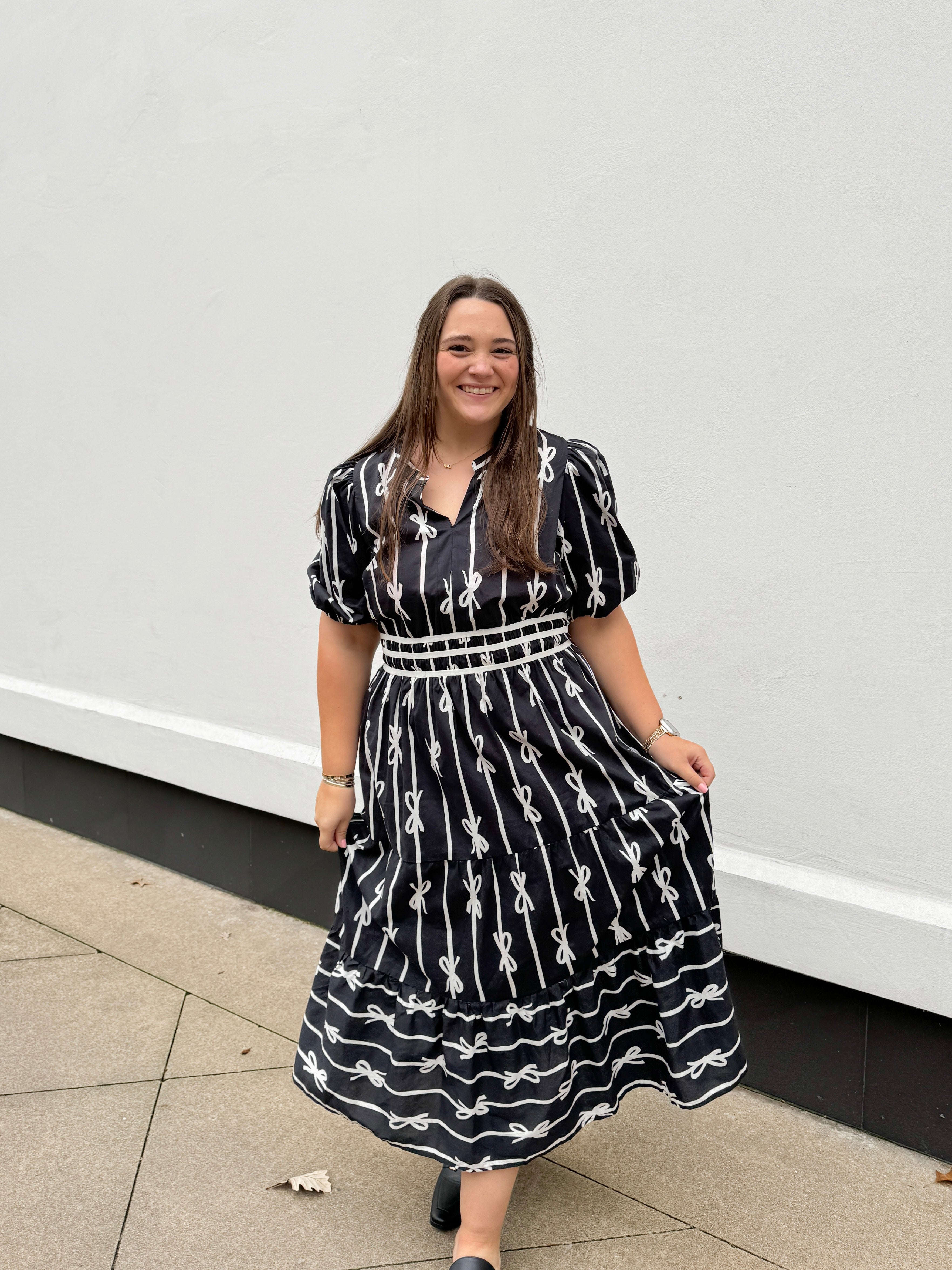 This A-Line dress is tied with cheer and style! With contrast velvet trim and a tiered design, it's perfect for any occasion. The V-Notched neckline adds a touch of playfulness to this already charming dress. Twirl your way through the day in this unique and fun piece.