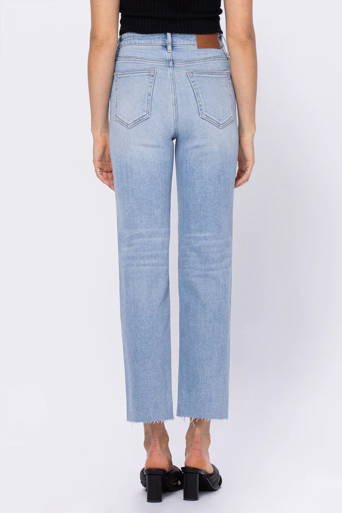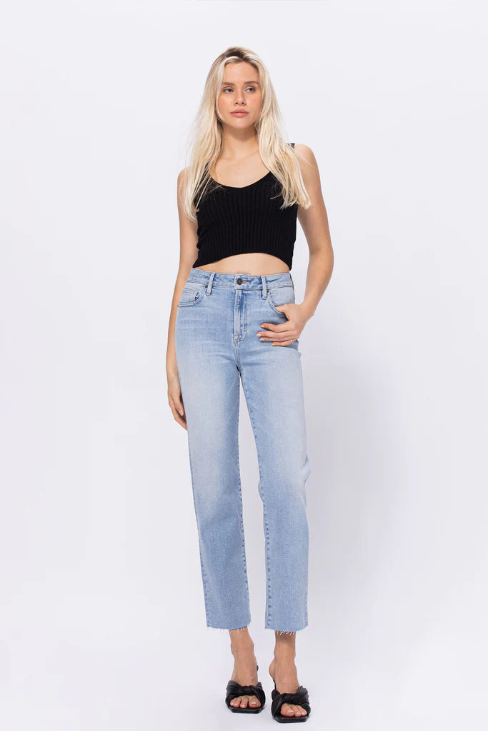 "Step into spring with our Tracey High Rise Straight Super Light Blue jeans! Made from a comfortable blend of 93% cotton, 5% polyester, and 2% spandex, these jeans feature a clean cropped cut and a super light wash for a fresh, modern look. With a front rise of 11 inches and inseam of 28 inches, they'll flatter your figure while keeping you cool and stylish. Model is wearing a size 26. (So you know they look good!)"