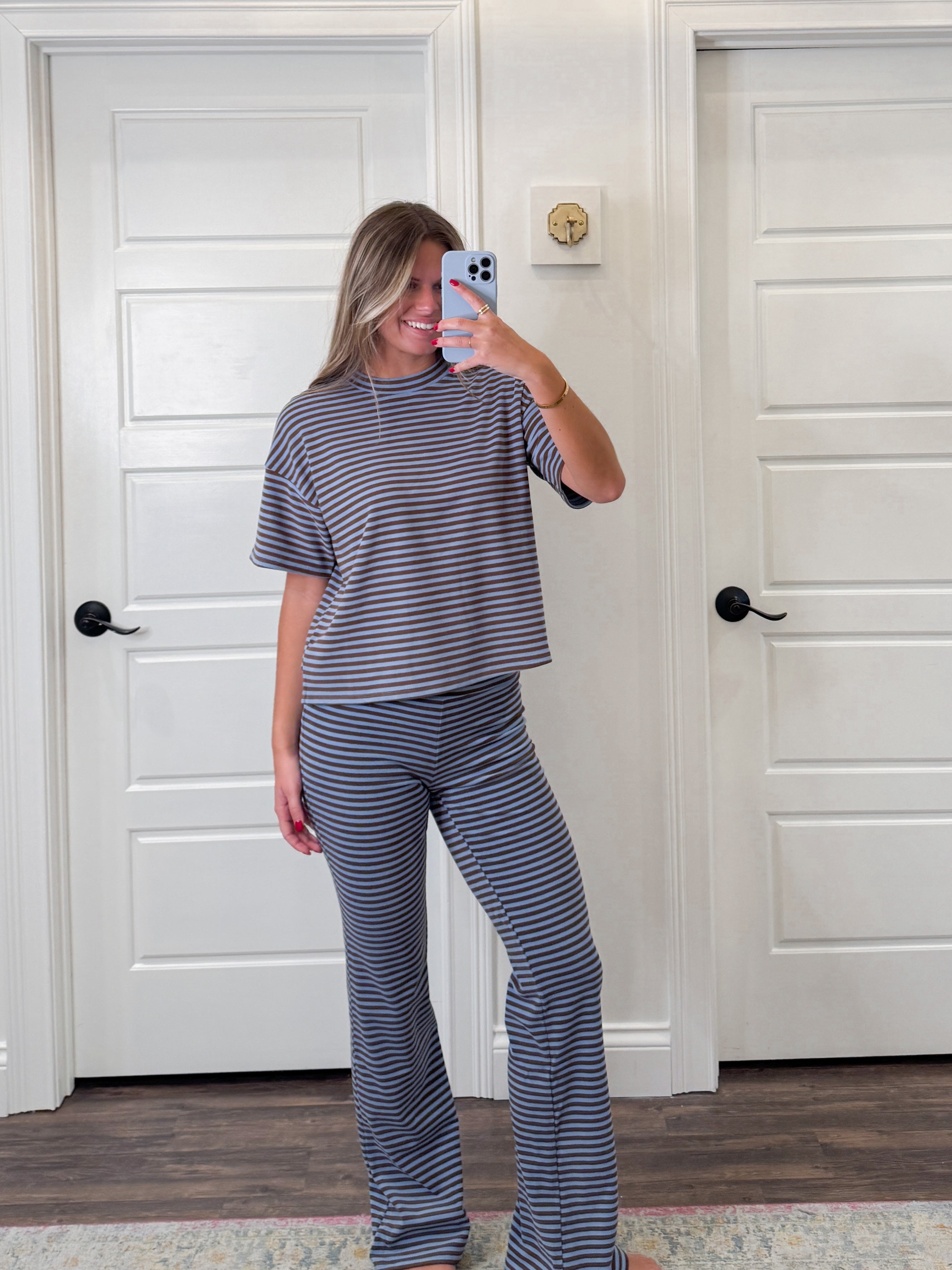 Embrace your coziest weekend vibes in this charming lounge set! Featuring a relaxed short-sleeve top paired with wide-leg leggings, this blue and brown striped ensemble is your new go-to for laid-back comfort. The playful striped pattern adds visual interest while the breathable fabric keeps you feeling fresh from morning coffee to evening relaxation. Perfect for lounging at home, running errands, or those days when style meets ultimate comfort. Effortless, chic, and undeniably cozy—because weekends are meant for feeling good!