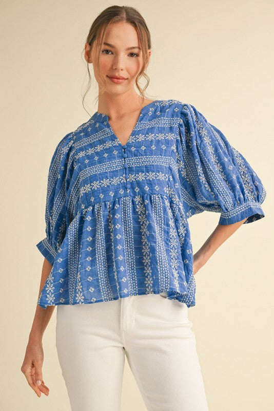 Embrace the charm of our Wildflower Whim Top! This delightful blue top features elegant white embroidery and comfortable 3/4 length sleeves that transition perfectly from day to night. The playful design adds a touch of whimsy to your wardrobe while keeping you stylishly comfortable for any occasion.